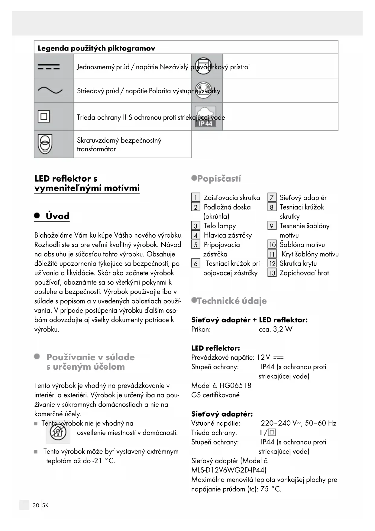 Zapichovací hrot Technické údaje Sieťový adaptér + LED reflektor: Príkon: cca. 3,2 W LED reflektor: Prevádzkové napätie: 12 V Stupeň ochrany: IP44 (s ochranou proti striekajúcej vode) Model č. HG06518 GS certifikované Sieťový adaptér: Vstupné napätie: 220–240 V∼, 50–60 Hz Trieda ochrany: II / Stupeň ochrany: IP44 (s ochranou proti striekajúcej vode) Sieťový adaptér (Model č. MLS-D12V6WG2D-IP44) Maximálna menovitá teplota vonkajšej plochy pre napájanie prúdom (tc): 75 °C.31 SK Obsah dodávky 1 LED reflektor s vymeniteľnými motívmi 1 sieťový adaptér 1 zapichovací hrot so skrutkou 1 podložná doska (okrúhla) 6 šablón motívu 1 návod na používanie