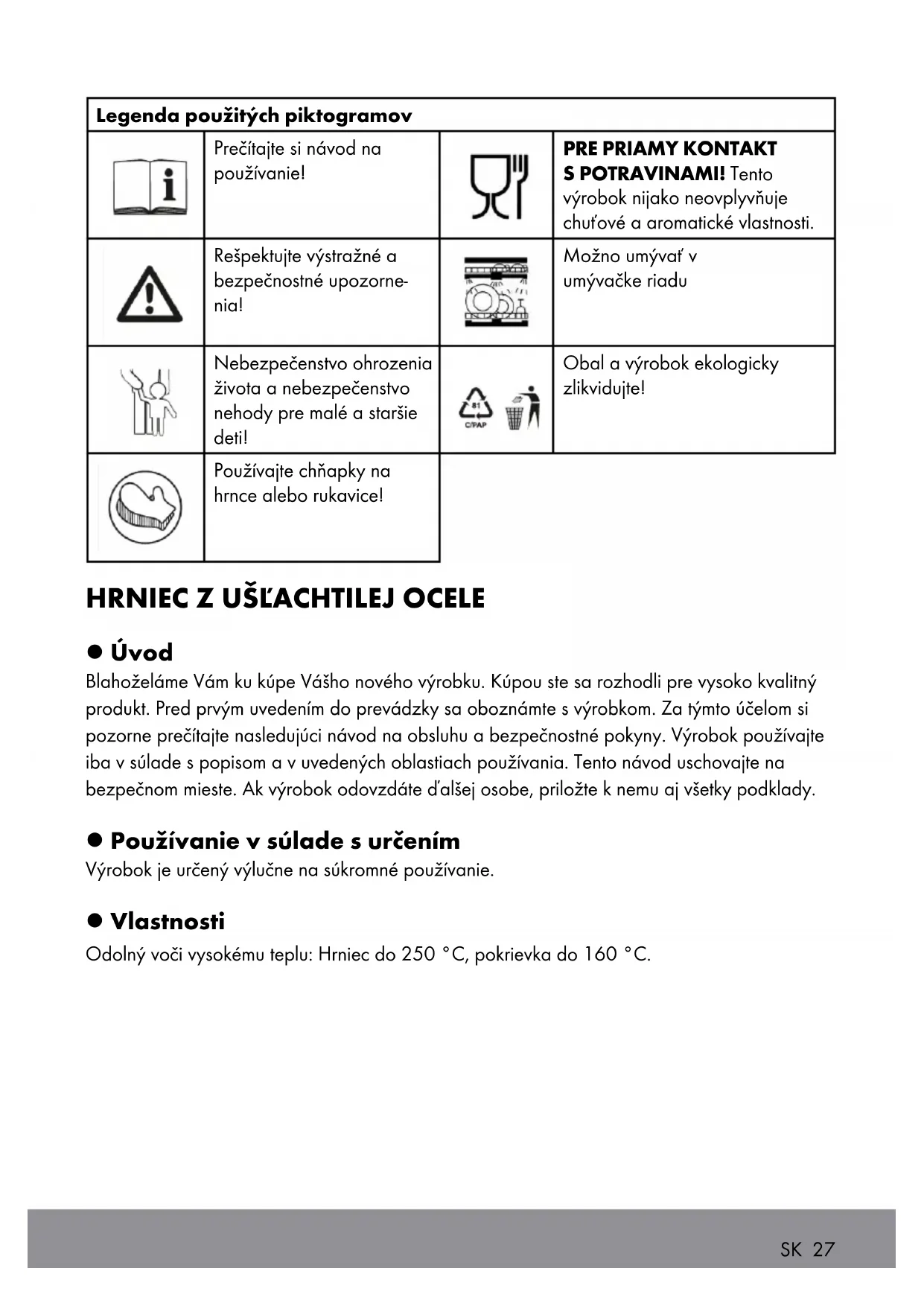 | i | Precítaje si námod na používanie! | PRE PRIAMY KONTAKT S POTRAVINAMI! Tento vyrobok nijako neovplyvůje chuťové a aromatické vlastnosti. | |