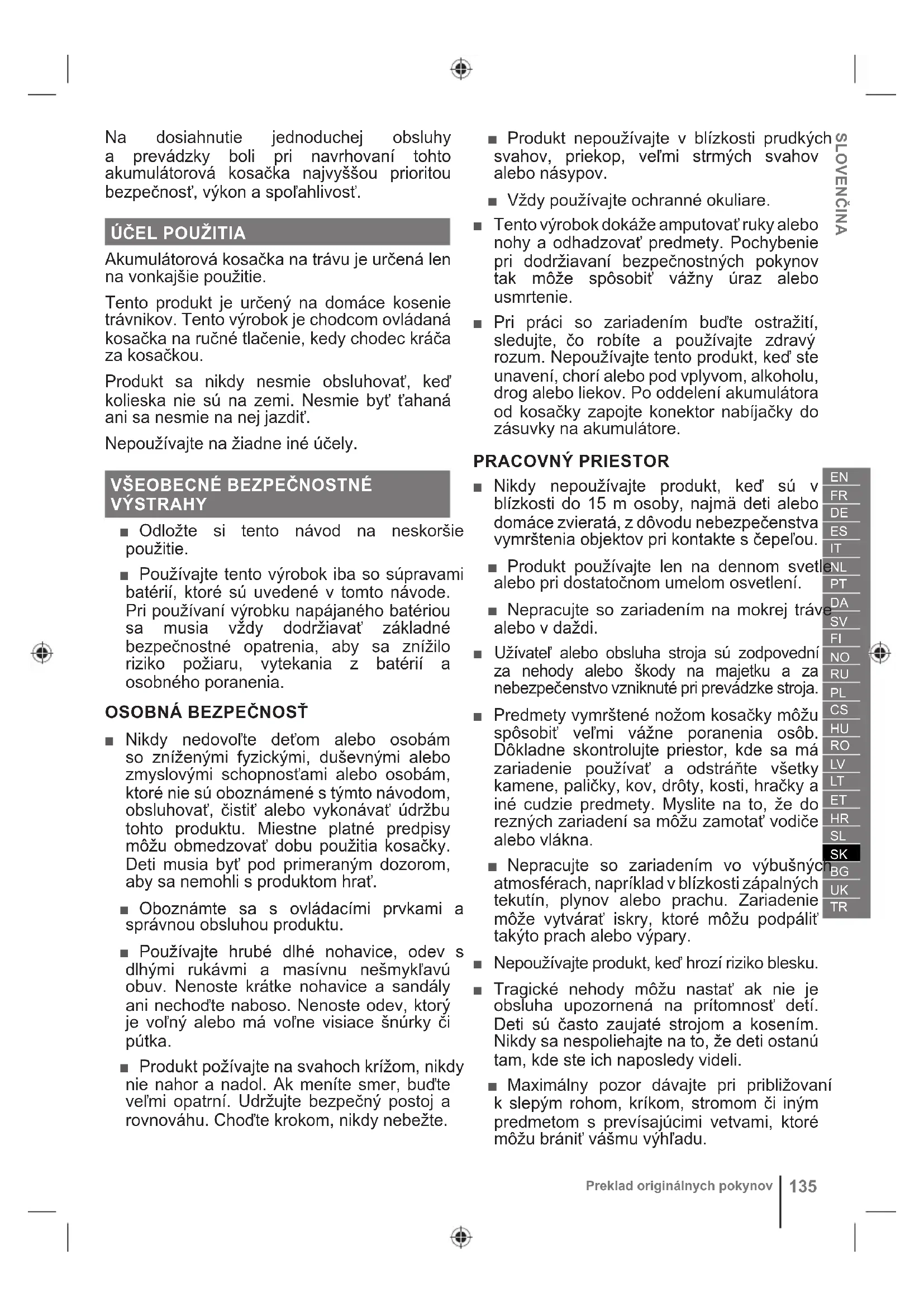 ■ Nikdy nedovoľte deťom alebo osobám so zníženými fyzickými, duševnými alebo zmyslovými schopnosťami alebo osobám, ktoré nie sú oboznámené s týmto návodom, obsluhovať, čistiť alebo vykonávať údržbu tohto produktu. Miestne platné predpisy môžu obmedzovať dobu použitia kosačky. Deti musia byť pod primeraným dozorom, aby sa nemohli s produktom hrať. ■ Oboznámte sa s ovládacími prvkami a správnou obsluhou produktu. ■ Používajte hrubé dlhé nohavice, odev s dlhými rukávmi a masívnu nešmykľavú obuv. Nenoste krátke nohavice a sandály ani nechoďte naboso. Nenoste odev, ktorý je voľný alebo má voľne visiace šnúrky či pútka. ■ Produkt požívajte na svahoch krížom, nikdy nie nahor a nadol. Ak meníte smer, buďte veľmi opatrní. Udržujte bezpečný postoj a rovnováhu. Choďte krokom, nikdy nebežte. ■ Produkt nepoužívajte v blízkosti prudkých svahov, priekop, veľmi strmých svahov alebo násypov. ■ Vždy používajte ochranné okuliare. ■ Tento výrobok dokáže amputovať ruky alebo nohy a odhadzovať predmety. Pochybenie pri dodržiavaní bezpečnostných pokynov tak môže spôsobiť vážny úraz alebo usmrtenie. ■ Pri práci so zariadením buďte ostražití, sledujte, čo robíte a používajte zdravý rozum. Nepoužívajte tento produkt, keď ste unavení, chorí alebo pod vplyvom, alkoholu, drog alebo liekov. Po oddelení akumulátora od kosačky zapojte konektor nabíjačky do zásuvky na akumulátore. PRACOVNÝ PRIESTOR ■ Nikdy nepoužívajte produkt, keď sú v blízkosti do 15 m osoby, najmä deti alebo domáce zvieratá, z dôvodu nebezpečenstva vymrštenia objektov pri kontakte s čepeľou. ■ Produkt používajte len na dennom svetle alebo pri dostatočnom umelom osvetlení. ■ Nepracujte so zariadením na mokrej tráve alebo v daždi. ■ Užívateľ alebo obsluha stroja sú zodpovední za nehody alebo škody na majetku a za nebezpečenstvo vzniknuté pri prevádzke stroja. ■ Predmety vymrštené nožom kosačky môžu spôsobiť veľmi vážne poranenia osôb. Dôkladne skontrolujte priestor, kde sa má zariadenie používať a odstráňte všetky kamene, paličky, kov, drôty, kosti, hračky a iné cudzie predmety. Myslite na to, že do rezných zariadení sa môžu zamotať vodiče alebo vlákna. ■ Nepracujte so zariadením vo výbušných atmosférach, napríklad v blízkosti zápalných tekutín, plynov alebo prachu. Zariadenie môže vytvárať iskry, ktoré môžu podpáliť takýto prach alebo výpary. ■ Nepoužívajte produkt, keď hrozí riziko blesku. ■ Tragické nehody môžu nastať ak nie je obsluha upozornená na prítomnosť detí. Deti sú často zaujaté strojom a kosením. Nikdy sa nespoliehajte na to, že deti ostanú tam, kde ste ich naposledy videli. ■ Maximálny pozor dávajte pri približovaní k slepým rohom, kríkom, stromom či iným predmetom s prevísajúcimi vetvami, ktoré môžu brániť vášmu výhľadu.136 Preklad originálnych pokynov