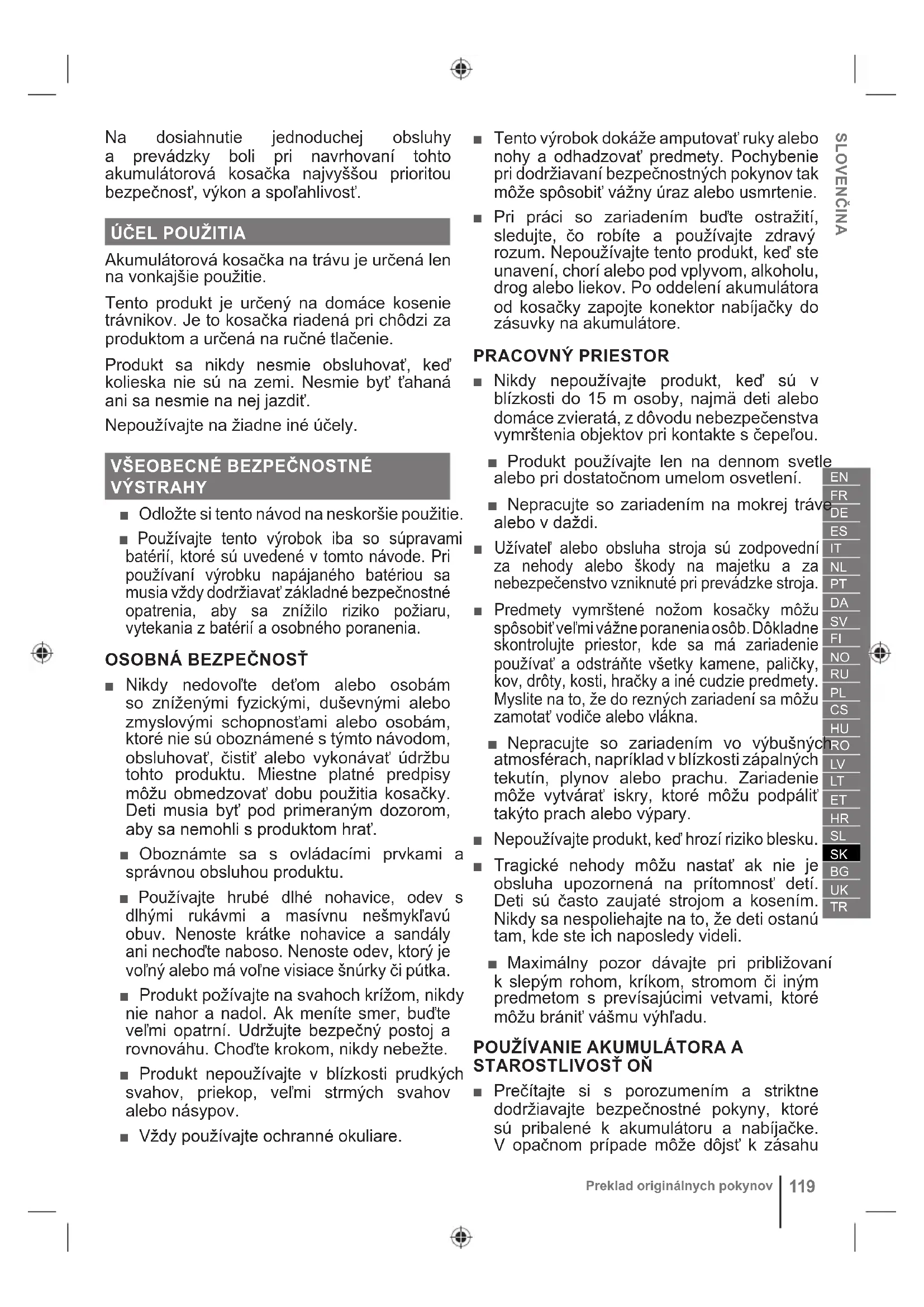 ■ Nikdy nedovoľte deťom alebo osobám so zníženými fyzickými, duševnými alebo zmyslovými schopnosťami alebo osobám, ktoré nie sú oboznámené s týmto návodom, obsluhovať, čistiť alebo vykonávať údržbu tohto produktu. Miestne platné predpisy môžu obmedzovať dobu použitia kosačky. Deti musia byť pod primeraným dozorom, aby sa nemohli s produktom hrať. ■ Oboznámte sa s ovládacími prvkami a správnou obsluhou produktu. ■ Používajte hrubé dlhé nohavice, odev s dlhými rukávmi a masívnu nešmykľavú obuv. Nenoste krátke nohavice a sandály ani nechoďte naboso. Nenoste odev, ktorý je voľný alebo má voľne visiace šnúrky či pútka. ■ Produkt požívajte na svahoch krížom, nikdy nie nahor a nadol. Ak meníte smer, buďte veľmi opatrní. Udržujte bezpečný postoj a rovnováhu. Choďte krokom, nikdy nebežte. ■ Produkt nepoužívajte v blízkosti prudkých svahov, priekop, veľmi strmých svahov alebo násypov. ■ Vždy používajte ochranné okuliare. ■ Tento výrobok dokáže amputovať ruky alebo nohy a odhadzovať predmety. Pochybenie pri dodržiavaní bezpečnostných pokynov tak môže spôsobiť vážny úraz alebo usmrtenie. ■ Pri práci so zariadením buďte ostražití, sledujte, čo robíte a používajte zdravý rozum. Nepoužívajte tento produkt, keď ste unavení, chorí alebo pod vplyvom, alkoholu, drog alebo liekov. Po oddelení akumulátora od kosačky zapojte konektor nabíjačky do zásuvky na akumulátore. PRACOVNÝ PRIESTOR ■ Nikdy nepoužívajte produkt, keď sú v blízkosti do 15 m osoby, najmä deti alebo domáce zvieratá, z dôvodu nebezpečenstva vymrštenia objektov pri kontakte s čepeľou. ■ Produkt používajte len na dennom svetle alebo pri dostatočnom umelom osvetlení. ■ Nepracujte so zariadením na mokrej tráve alebo v daždi. ■ Užívateľ alebo obsluha stroja sú zodpovední za nehody alebo škody na majetku a za nebezpečenstvo vzniknuté pri prevádzke stroja. ■ Predmety vymrštené nožom kosačky môžu spôsobiť veľmi vážne poranenia osôb. Dôkladne skontrolujte priestor, kde sa má zariadenie používať a odstráňte všetky kamene, paličky, kov, drôty, kosti, hračky a iné cudzie predmety. Myslite na to, že do rezných zariadení sa môžu zamotať vodiče alebo vlákna. ■ Nepracujte so zariadením vo výbušných atmosférach, napríklad v blízkosti zápalných tekutín, plynov alebo prachu. Zariadenie môže vytvárať iskry, ktoré môžu podpáliť takýto prach alebo výpary. ■ Nepoužívajte produkt, keď hrozí riziko blesku. ■ Tragické nehody môžu nastať ak nie je obsluha upozornená na prítomnosť detí. Deti sú často zaujaté strojom a kosením. Nikdy sa nespoliehajte na to, že deti ostanú tam, kde ste ich naposledy videli. ■ Maximálny pozor dávajte pri približovaní k slepým rohom, kríkom, stromom či iným predmetom s prevísajúcimi vetvami, ktoré môžu brániť vášmu výhľadu.