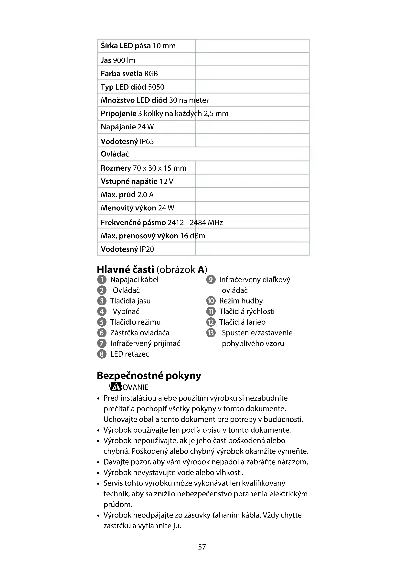 Rýchly návod Inteligentný LED pás s funkciou Wi-Fi WIFILS51CRGB Viac informácií nájdete v rozšírenom návode online:ned.is/wils51crgb Určené použitie Tento výrobok je inteligentný LED pás s funkciou Wi-Fi s bezdrôtovým diaľkovým ovládačom. Výrobok nie je určený na profesionálne použitie. Tento výrobok je určený na použitie vo vnútornom a vonkajšom prostredí. Každá zmena výrobku môže mať následky na bezpečnosť, záruku a správne fungovanie. Technické údaje Produkt Inteligentný LED pás s funkciou Wi-Fi Číslo výrobku WIFILS51CRGB LED reťazec Dĺžka LED pása 5 m57 Šírka LED pása 10 mm Jas 900 lm Farba svetla RGB Typ LED diód 5050 Množstvo LED diód 30 na meter Pripojenie 3 kolíky na každých 2,5 mm Napájanie 24 W Vodotesný IP65 Ovládač Rozmery 70 x 30 x 15 mm Vstupné napätie 12 V Max. prúd 2,0 A Menovitý výkon 24 W Frekvenčné pásmo 2412 - 2484 MHz Max. prenosový výkon 16 dBm Vodotesný IP20 Hlavné časti (obrázok A) 1 Napájací kábel 2 Ovládač 3 Tlačidlá jasu 4 Vypínač 5 Tlačidlo režimu 6 Zástrčka ovládača 7 Infračervený prijímač 8 LED reťazec 9 Infračervený diaľkový ovládač q Režim hudby w Tlačidlá rýchlosti e Tlačidlá farieb r Spustenie/zastavenie pohyblivého vzoru Bezpečnostné pokyny