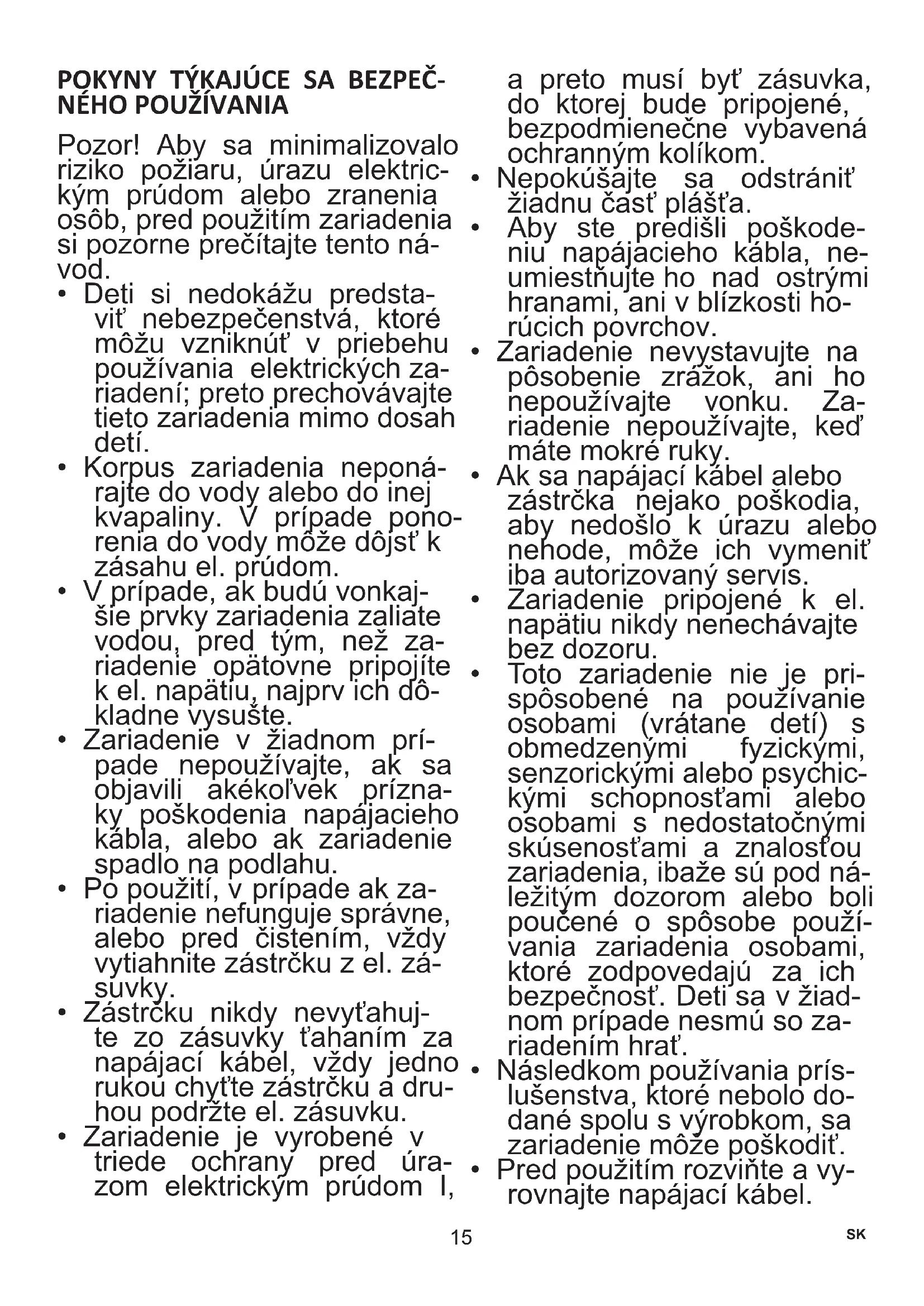 - Zariadenie je vyrobené v triede ochrany pred úra- zom elektrickým prúdom I, a preto musí byť zásuvka, do ktorej bude pripojené, bezpodmienečne vybavená ochranným kolíkom.