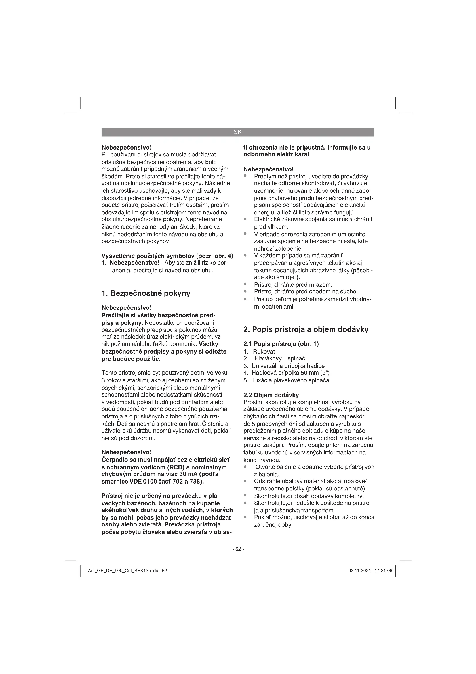 Nebezpečenstvo! Prečítajte si všetky bezpečnostné pred- pisy a pokyny. Nedostatky pri dodržovaní bezpečnostných predpisov a pokynov môžu mať za následok úraz elektrickým prúdom, vz- nik požiaru a/alebo ťažké poranenia. Všetky bezpečnostné predpisy a pokyny si odložte pre budúce použitie. Tento prístroj smie byť používaný deťmi vo veku 8 rokov a staršími, ako aj osobami so zníženými psychickými, senzorickými alebo mentálnymi schopnosťami alebo nedostatkami skúseností a vedomostí, pokiaľ budú pod dohľadom alebo budú poučené ohľadne bezpečného používania prístroja a o príslušných z toho plynúcich rizi- kách. Deti sa nesmú s prístrojom hrať. Čistenie a užívateľskú údržbu nesmú vykonávať deti, pokiaľ nie sú pod dozorom. Nebezpečenstvo! Čerpadlo sa musí napájať cez elektrickú sieť s ochranným vodičom (RCD) s nominálnym chybovým prúdom najviac 30 mA (podľa smernice VDE 0100 časť 702 a 738). Prístroj nie je určený na prevádzku v pla- veckých bazénoch, bazénoch na kúpanie akéhokoľvek druhu a iných vodách, v ktorých by sa mohli počas jeho prevádzky nachádzať osoby alebo zvieratá. Prevádzka prístroja počas pobytu človeka alebo zvieraťa v oblas- ti ohrozenia nie je prípustná. Informujte sa u odborného elektrikára! Nebezpečenstvo!