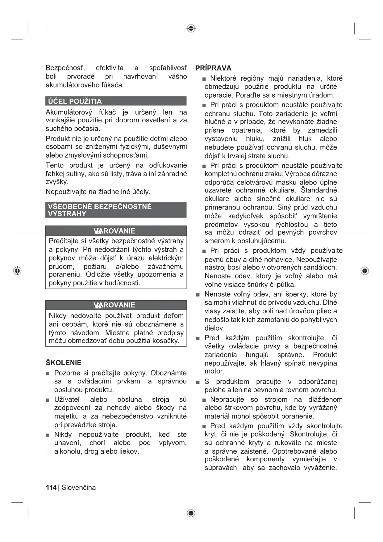Poškodené alebo nečitateľné štítky vymeňte. ■ Keď sa v blízkosti nachádzajú iné osoby, najmä deti alebo domáce zvieratá, nepoužívajte nástroj. ■ Zo všetkých otvorov na chladiaci vzduch odstraňujte úlomky. ■ Pred fúkaním uvoľnite záhradný odpad pomocou hrablí a metly. ■ Pred každým použitím vyčistite pracovisko. Odstráňte všetky objekty ako kamene, rozbité sklo, klince, drôty alebo pružiny, ktoré by sa mohli vymrštiť do značnej vzdialenosti následkom vysokej rýchlosti vzduchu.