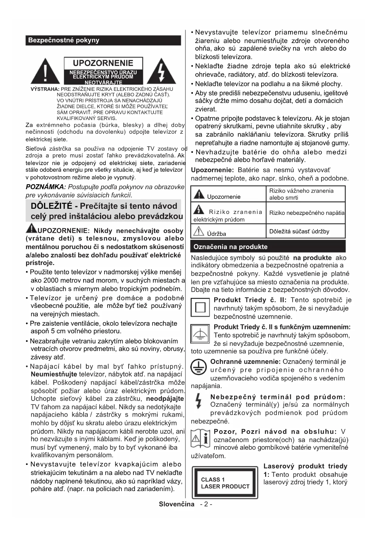 CLASS 1LASER PRODUCTSlovenčina - 3 - je bezpečný za rozumne predvídateľných podmienok prevádzky. UPOZORNENIE Batérie neprehĺtajte, riziko chemického popálenia Tento výrobok alebo jeho príslušenstvo dodávané s výrobkom môže obsahovať gombíkovú/mincovú batériu. Ak dôjde k požitiu gombíkovej batérie, môže to spôsobiť vážne vnútorné popáleniny v priebehu 2 hodín a môže to viesť k smrti. Udržujte nové a použité batérie mimo dosahu detí. Ak časť s batériou nie je možné bezpečne uzavrieť, prestaňte výrobok používať a odložte ho mimo dosahu detí. Ak si myslíte, že batérie by sa mohli prehltnúť alebo dostať do nejakej časti tela, ihneď vyhľadajte zdravotnícku pomoc. UPOZORNENIE Nikdy nepokladajte televízor na nestabilné alebo šikmé miesta. TV môže spadnúť a spôsobiť vážne zranenia alebo smrť. Veľkému množstvu zranení, najme detí, je možné sa vyhnúť jednoduchými opatreniami;