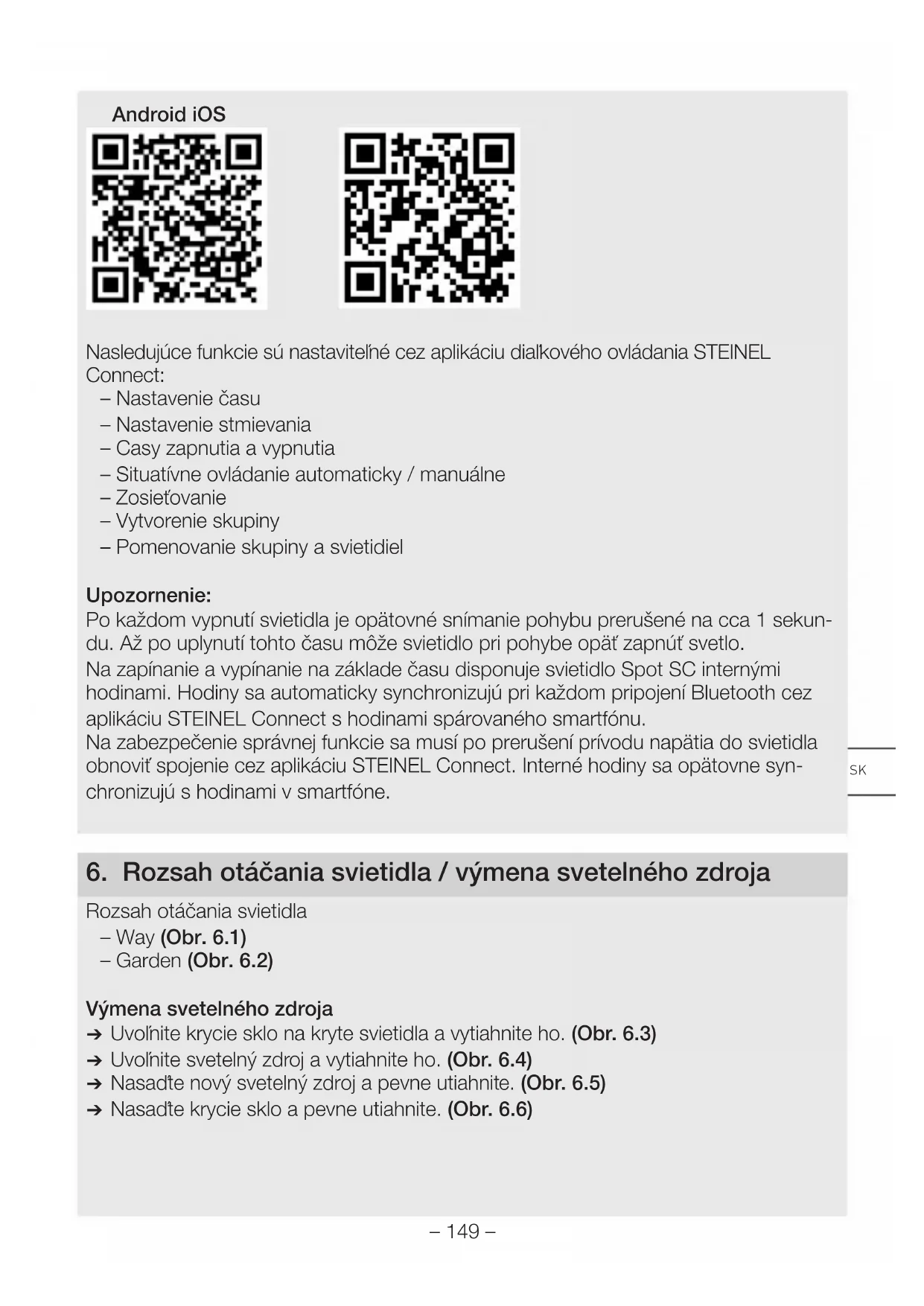 Spot Way SC/Spot Garden SC Nastavenia z výroby – Nastavenie stmievania: 2.000 lx – Nastavenie času: 5 sekúnd Aplikácia diaľkového ovládania STEINEL Connect Na konfiguráciu svietidla pomocou smartfónu alebo tabletu si musíte stiahnuť apliká- ciu STEINEL Connect vo svojom AppStore. Na to je potrebný smartfón alebo tablet s funkciou Bluetooth.– 149 – Android iOS Nasledujúce funkcie sú nastaviteľné cez aplikáciu diaľkového ovládania STEINEL Connect: – Nastavenie času – Nastavenie stmievania – Casy zapnutia a vypnutia – Situatívne ovládanie automaticky/manuálne – Zosieťovanie – Vytvorenie skupiny – Pomenovanie skupiny a svietidiel Upozornenie: Po každom vypnutí svietidla je opätovné snímanie pohybu prerušené na cca 1sekun- du. Až po uplynutí tohto času môže svietidlo pri pohybe opäť zapnúť svetlo. Na zapínanie a vypínanie na základe času disponuje svietidlo Spot SC internými hodinami. Hodiny sa automaticky synchronizujú pri každom pripojení Bluetooth cez aplikáciu STEINEL Connect shodinami spárovaného smartfónu. Na zabezpečenie správnej funkcie sa musí po prerušení prívodu napätia do svietidla obnoviť spojenie cez aplikáciu STEINEL Connect. Interné hodiny sa opätovne syn- chronizujú s hodinami v smartfóne.