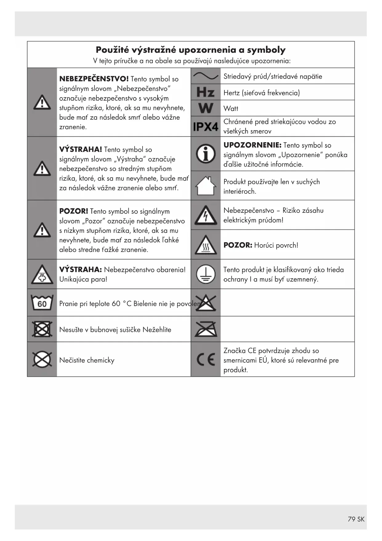 Úvod Blahoželáme Vám ku kúpe Vášho nového výrobku. Rozhodli ste sa pre veľmi kvalitný výrobok. Návod na obsluhu je súčasťou tohto výrobku. Obsahuje dôležité upozornenia týkajúce sa bezpečnosti, používania a likvidácie. Skôr ako začnete výrobok používať, oboznámte sa so všetkými pokynmi k obsluhe a bezpečnosti. Výrobok používajte iba v súlade s popisom a v uvedených oblastiach používania. V prípade postúpenia výrobku ďalším osobám odovzdajte aj všetky dokumenty patriace k výrobku. Použitie v súlade s určením Tento výrobok je určený výlučne na čistenie povrchov v interiéroch, ktoré sú vhodné na dlhé čistenie horúcou parou. Vhodné pre: Dlaždice, pracovné plochy, obkladačky, zrkadlá, okná, žalúzie, WC, armatúry, závesy, čalúnený nábytok, odevy, sedadlá v automobiloch. Nevhodné pre: Kožu, leštený nábytok, voskované podlahy, syntetické materiály, zamat a všetky iné citlivé materiály nevhodné na čistenie parou. Používanie na voskovaných alebo na niektorých nevoskovaných podlahách môže spôsobiť zníženie ich lesku. Pred použitím: Odporúčame vykonať test materiálu na nenápadnom mieste čisteného povrchu. Pre lepšie výsledky po vyčistení: Dbajte na pokyny o starostlivosti od príslušného výrobcu (ak sú uvedené). Produkt nepoužívajte na iné účely. Produkt je určený len na použitie v súkromných domácnostiach a nie na komerčné účely. Výrobca nepreberá žiadnu zodpovednosť za škody spôsobené neodborným používaním. Pred použitím: Vykonajte test na nenápadnom mieste. Takto si môžete overiť, či je materiál vhodný na čistenie parou. Príklady: Natierané/lakované drevo alebo koža môžu po čistení parou vyblednúť. Neošetrené drevo môže pôsobením pary napučať. Ochranné voskové nátery sa môžu pôsobením pary zničiť. Plasty sa môžu pôsobením pary stať matnými. Mäkké plasty sa môžu po vystavení účinkom pary zdeformovať. Studené sklenené alebo zrkadlové povrchy sa môžu pri postriekaní horúcou parou prasknúť. Akryl, zamat a hodváb reagujú na horúcu paru citlivo. Ak chcete očistiť okno, mali by ste ho najprv ohriať: Použite paru z väčšej vzdialenosti a na veľkú plochu. Vzdialenosť postupne znižujte.81 SK Rozsah dodávky Po vybalení produktu skontrolujte, či je dodávka kompletná a či sú všetky časti v požadovanom stave. Pred používaním odstráňte všetky obalové materiály. 1 Ručný parný čistiaci prístroj 1 Predlžovacia hadica 1 Predlžovacia dýza 1 Čalúnená dýza 1 Ohnutá dýza 1 Guľatá kefa 1 Stierka na okná 1 Lievik 1 Bavlnený návlek 1 Odmerka 1 Návod na obsluhu Popis súčiastok Pred čítaním si rozložte stranu s nákresmi. Oboznámte sa so všetkými funkciami produktu. [1] Výstup pary [2] Vstup a nádrž na vodu [3] Bezpečnostný ventil [4] Detská poistka [5] Spúšťač pary [6] Rukoväť [7] Napájací kábel so sieťovou zástrčkou [8] Stierka na okná [9] Čalúnená dýza [] Bavlnený návlek [] Lievik [] Predlžovacia hadica [] Odmerka [] Ohnutá dýza [] Predlžovacia dýza [] Guľatá kefa [] Kontrolka „Power“ (červená) [] Kontrolka pary (zelená) Technické údaje Menovité napätie, menovitá frekvencia: 220–240 V∼, 50/60 Hz Príkon: 900‒1050 W Kapacita nádrže na vodu: 350 ml (250 ml plná kapacita) Kapacita odmerky: 250 ml plná kapacita Trieda ochrany: I IP druh ochrany: IPX4 (odolný proti striekajúcej vode) Bezpečnostné upozornenia