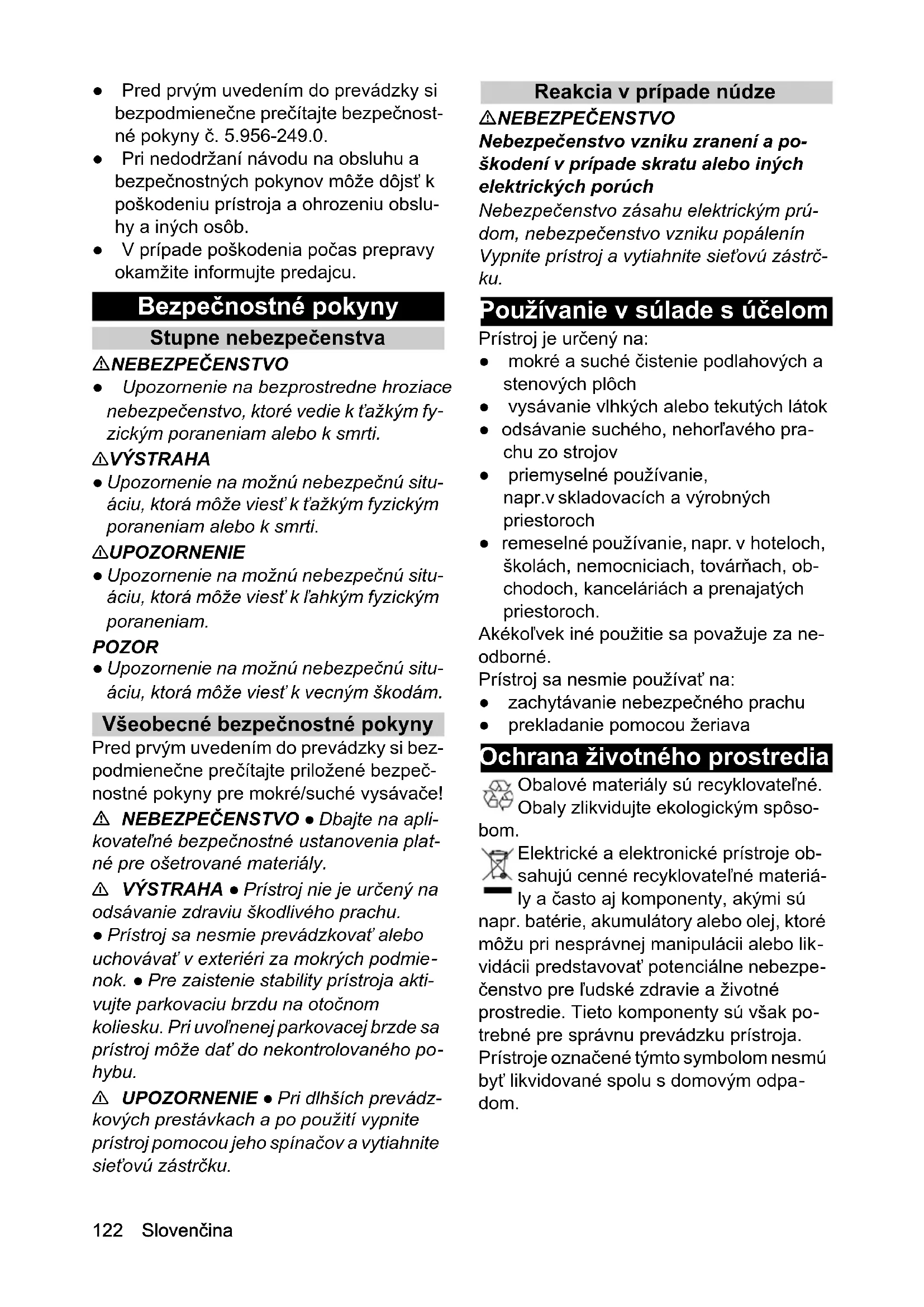 hybu. 몇 UPOZORNENIE ● Pri dlhších prevádz- kových prestávkach a po použití vypnite prístroj pomocou jeho spínačov a vytiahnite sieťovú zástrčku. Reakcia v prípade núdze NEBEZPEČENSTVO Nebezpečenstvo vzniku zranení a po- škodení v prípade skratu alebo iných elektrických porúch Nebezpečenstvo zásahu elektrickým prú- dom, nebezpečenstvo vzniku popálenín Vypnite prístroj a vytiahnite sieťovú zástrč- ku. Používanie v súlade s účelom Prístroj je určený na: ● mokré a suché čistenie podlahových a stenových plôch ● vysávanie vlhkých alebo tekutých látok ● odsávanie suchého, nehorľavého pra- chu zo strojov ● priemyselné používanie, napr.v skladovacích a výrobných priestoroch ● remeselné používanie, napr. v hoteloch, školách, nemocniciach, továrňach, ob- chodoch, kanceláriách a prenajatých priestoroch. Akékoľvek iné použitie sa považuje za ne- odborné. Prístroj sa nesmie používať na: ● zachytávanie nebezpečného prachu ● prekladanie pomocou žeriava Ochrana životného prostredia Obalové materiály sú recyklovateľné. Obaly zlikvidujte ekologickým spôso- bom. Elektrické a elektronické prístroje ob- sahujú cenné recyklovateľné materiá- ly a často aj komponenty, akými sú napr. batérie, akumulátory alebo olej, ktoré môžu pri nesprávnej manipulácii alebo lik
