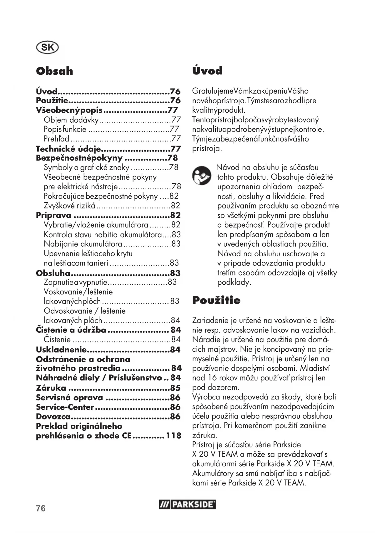 X 20 V TEAM a može sa prevadzkovat's akumulátormi série Parkside X 20 V TEAM. Akumulátory sa smú nabíjat iba s nabíjac-kami série Parkside X 20 V TEAM.