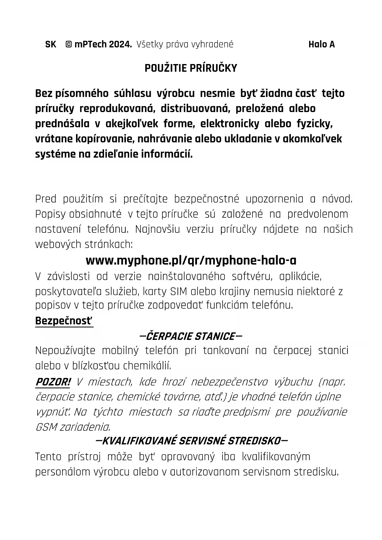 Pred použitím si prečítajte bezpečnostné upozornenia a návod. Popisy obsiahnuté v tejto príručke sú založené na predvolenom nastavení telefónu. Najnovšiu verziu príručky nájdete na našich webových stránkach: www.myphone.pl/qr/myphone-halo-a V závislosti od verzie nainštalovaného softvéru, aplikácie, poskytovateľa služieb, karty SIM alebo krajiny nemusia niektoré z popisov v tejto príručke zodpovedať funkciám telefónu. Bezpečnosť —ČERPACIE STANICE— Nepoužívajte mobilný telefón pri tankovaní na čerpacej stanici alebo v blízkosťou chemikálií. POZOR! V miestach, kde hrozí nebezpečenstvo výbuchu (napr. čerpacie stanice, chemické továrne, atď.) je vhodné telefón úplne vypnúť. Na týchto miestach sa riaďte predpismi pre používanie GSM zariadenia.