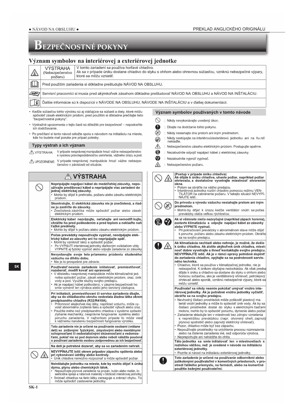 SK SK VÝSTRAHA Nepripájajte napájací kábel do medziľahlej zásuvky, nepo-užívajte predlžovací kábel a nepripájajte viac zariadení do jednej elektrickej zásuvky.• Mohlo by dôjsť k prehriatiu, požiaru alebo zásahu elektrickým prúdom.Skontrolujte, či elektrická zásuvka nie je znečistená, a riad-ne ju zastrčte do zásuvky.• Znečistená zástrčka môže spôsobiť požiar alebo zásah elektrickým prúdom.Elektrický kábel nezväzujte, neťahajte ani nemodifi kujte, chráňte ho pred poškodením a pred teplom a neklaďte naň ťažké predmety.• Mohlo by dôjsť k požiaru alebo zásahu elektrickým prúdom.Počas prevádzky nepoužívajte vypínač, neodpájajte elek-trický kábel zo zásuvky ani ho nepripájajte späť.• Mohli by vzniknúť iskry a spôsobiť požiar. Po VYPNUTÍ interiérovej jednotky diaľkovým ovládačom vždy VYPNITE aj fyzický vypínač alebo odpojte zariadenie zo zásuvky. Nevystavujte svoje telo priamemu prúdeniu studeného vzduchu na dlhšiu dobu.• Nie je to prospešné pre zdravie.Používateľ nesmie zariadenie inštalovať, premiestňovať, rozoberať, modifi kovať ani opravovať.• V dôsledku nesprávnej manipulácie môže klimatizačná jed-notka spôsobiť požiar, zásah elektrickým prúdom, úraz, únik vody a pod. Využite služby svojho predajcu.• Ak je napájací kábel poškodený, v záujme bezpečnosti ho smie vymeniť len výrobca alebo jeho servisný zástupca.Pri inštalácii, premiestňovaní či servise zariadenia dbajte, aby sa do chladiaceho okruhu nedostala žiadna látka okrem predpísaného chladiva (R32/R410A). Prítomnosť akejkoľvek inej látky, napríklad vzduchu, môže vy-volať abnormálne zvýšenie tlaku a spôsobiť výbuch alebo úraz.• Použitie iného než predpísaného chladiva v systéme spôsobí zlyhanie mechaniky, nesprávne fungovanie systému alebo poruchu zariadenia. V najhoršom prípade to môže viesť k vážnemu narušeniu bezpečnosti fungovania výrobku.Toto zariadenie nie je určené na používanie osobami (vrátane detí) so zníženými fyzickými, zmyslovými alebo mentálnymi schopnosťami či nedostatočnými skúsenosťami a vedomos-ťami, pokiaľ nie sú pod dozorom alebo neboli náležite poučené o používaní zariadenia osobou zodpovednou za ich bezpečnosť.Na deti je potrebné dozerať, aby sa so zariadením nehrali. NEVYPÍNAJTE istič okrem prípadov zápachu spálenia alebo pri vykonávaní údržby alebo kontroly.• Únik chladiva nemožno rozpoznať a môže spôsobiť požiar.Neinštalujte jednotku na mieste, kde by mohlo dôjsť k úniku dymu, plynu alebo chemických látok. Nepoužívajte plynové zariadenia na propán, bután alebo metán, in-sekticídne spreje a náterové materiály v blízkosti interiérovej jednotky.• Snímač chladiva na tieto látky zareaguje a zobrazí chybu. To môže spôsobiť zastavenie jednotky.• Keďže súčasťou tohto výrobku sú aj otáčajúce sa súčasti a diely, ktoré môžu spôsobiť zásah elektrickým prúdom, pred použitím si dôkladne prečítajte tieto “bezpečnostné pokyny”.• Výstražné upozornenia v tejto časti sú dôležité pre bezpečnosť – nepodceňte ich dodržiavanie.• Po prečítaní si tento návod odložte spolu s návodom na inštaláciu na mieste, kde ho budete mať poruke pre prípad potreby. Typy výstrah a ich význam VÝSTRAHA:V prípade nesprávnej manipulácie hrozí vážne nebezpečenstvo s vysokou pravdepodobnosťou usmrtenia, vážneho úrazu a pod. UPOZORNENIE:V prípade nesprávnej manipulácie hrozí vážne nebezpe-čenstvo v závislosti od situácie. (Postup v prípade úniku chladiva)Ak dôjde k úniku chladiva, uhaste požiar, napríklad požiar ohrievača, a dostatočne vyvetrajte miestnosť otvorením okna.• Potom sa obráťte na vášho predajcu.• Interiérová jednotka rozšíri chladivo pomocou režimu VEN-TILÁTOR na zabránenie požiaru. V takejto situácii NEVYPÍ-NAJTE istič. Do prívodu a vývodu vzduchu nesiahajte prstom ani iným predmetom.• Mohlo by dôjsť k úrazu, keďže ventilátor vnútri sa počas prevádzky otáča veľkou rýchlosťou. Ak si všimnete niečo nezvyčajné (napríklad zápach horenia), zastavte klimatizáciu a odpojte napájací kábel zo zásuvky alebo VYPNITE vypínač. Pri pokračovaní prevádzky v abnormálnom stave môže dôjsť k poruche, požiaru alebo zásahu elektrickým prúdom. Obráťte sa na svojho predajcu. Ak klimatizácia nechladí alebo nehreje, je možné, že došlo k úniku chladiva. Ak zistíte akýkoľvek únik chladiva, miest-nosť dobre vyvetrajte a ihneď kontaktujte svojho predajcu. NEVYPÍNAJTE istič. Ak je v rámci opravy potrebné doplniť do zariadenia chladivo, opýtajte sa na podrobnosti servis-ného technika.• Chladivo, ktoré sa používa v klimatizačnej jednotke, nie je nebezpečné. K únikom obyčajne nedochádza. Ak však predsa dôjde k úniku a chladivo sa dostane do styku s ohňom alebo horúcou súčasťou, ako je ventilátorový ohrievač, petrolejový ohrievač alebo sporák, vzniknú nebezpečné výpary, ktoré sa môžu vznietiť.Používateľ sa nikdy nesmie pokúšať umývať vnútro inte-riérovej jednotky. Ak je potrebné vnútro jednotky vyčistiť, obráťte sa na svojho predajcu.• Nevhodný čistiaci prostriedok môže poškodiť plastový ma-teriál vnútri jednotky a môže to spôsobiť únik vody. Ak by sa čistiaci prostriedok dostal do styku s elektrickými časťami motora, mohlo by to spôsobiť poruchu, dymenie alebo požiar.• Zariadenie skladujte len v miestnosti bez zdrojov vznietenia s nepretržitou prevádzkou (napr. otvorený oheň, zapnutý plynový spotrebič alebo zapnutý elektrický ohrievač).• Pozor, chladivo môže byť bez zápachu.• Nepoužívajte prostriedky na urýchlenie procesu rozmrazenia alebo na čistenie zariadenia iné, než odporúča výrobca.• Neprepichujte ani nehádžte do ohňa.Táto je