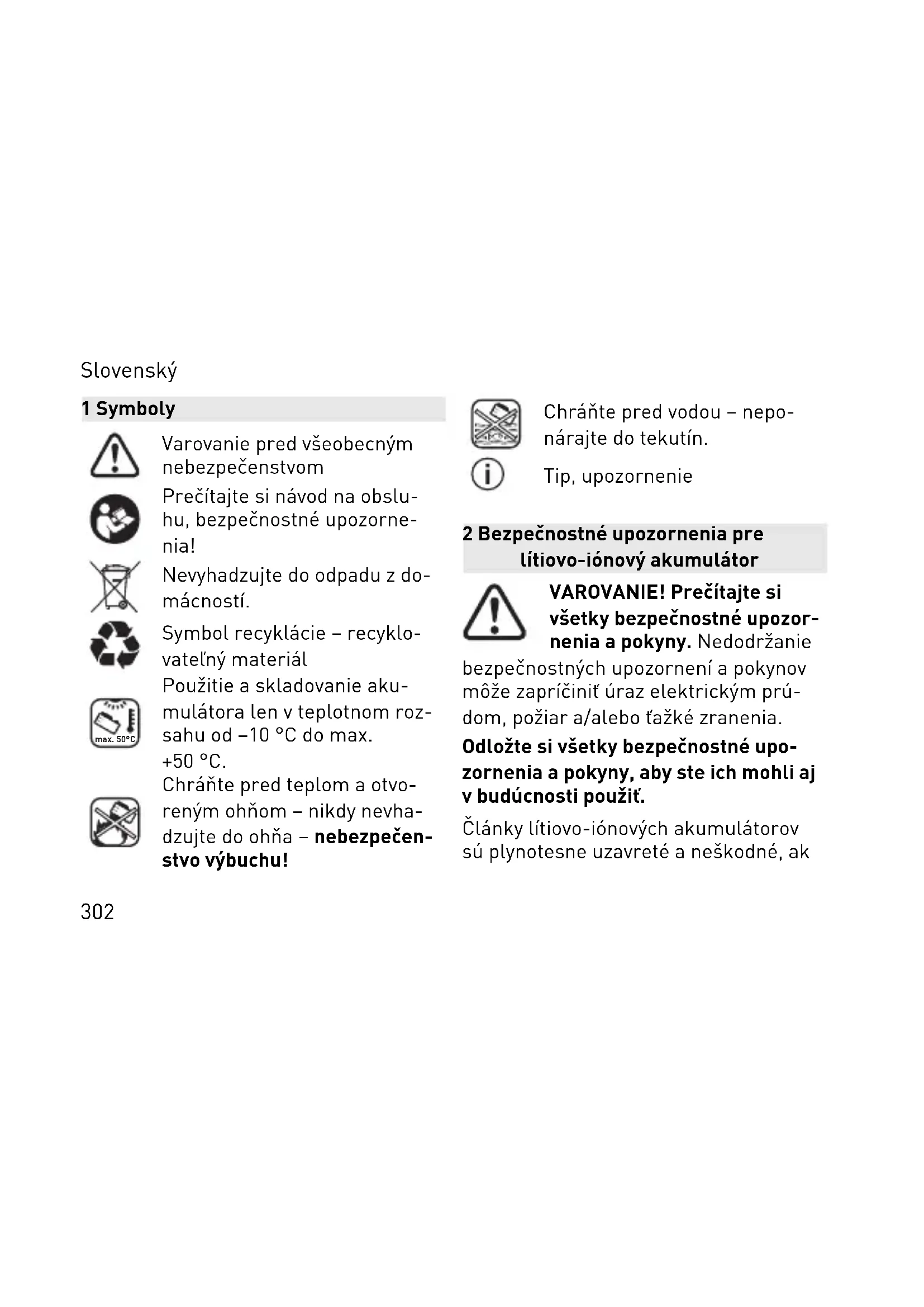 zaobchádzanie s akumulátorom Akumulátor sa dodáva čiastočne nabitý. Aby bol zaručený plný vý kon akumulátora, pred prvým použitím akumulátor úplne nabi te v nabíjačke. Akumulátor sa môže nabíjať kedykoľvek bez toho, aby sa skrátila jeho životnosť. Prerušenie procesu nabíjania akumulá tor nepoškodí. Po automatickom vypnutí elektrického náradia nestlá čajte ďalej vypínač. Akumu látor sa môže poškodiť. Akumulátor je vybavený snímačom te ploty, ktorý umožňuje nabíjanie len v te plotnom rozmedzí 0 °C až 55 °C. Do siahne sa tak dlhá životnosť akumuláto ra. – Akumulátor skladujte podľa možnosti na chladnom (5 °C až 25 °C) a suchom (vlhkosť vzduchu < 80 %) mieste. – Akumulátor nenechávajte, napr. v le te, ležať v aute. Slovenský 307– Podstatne skrátený prevádzkový čas po nabití znamená, že akumulátor je opotrebovaný a musí sa vymeniť. – Dodržiavajte upozornenia týkajúce sa likvidácie.