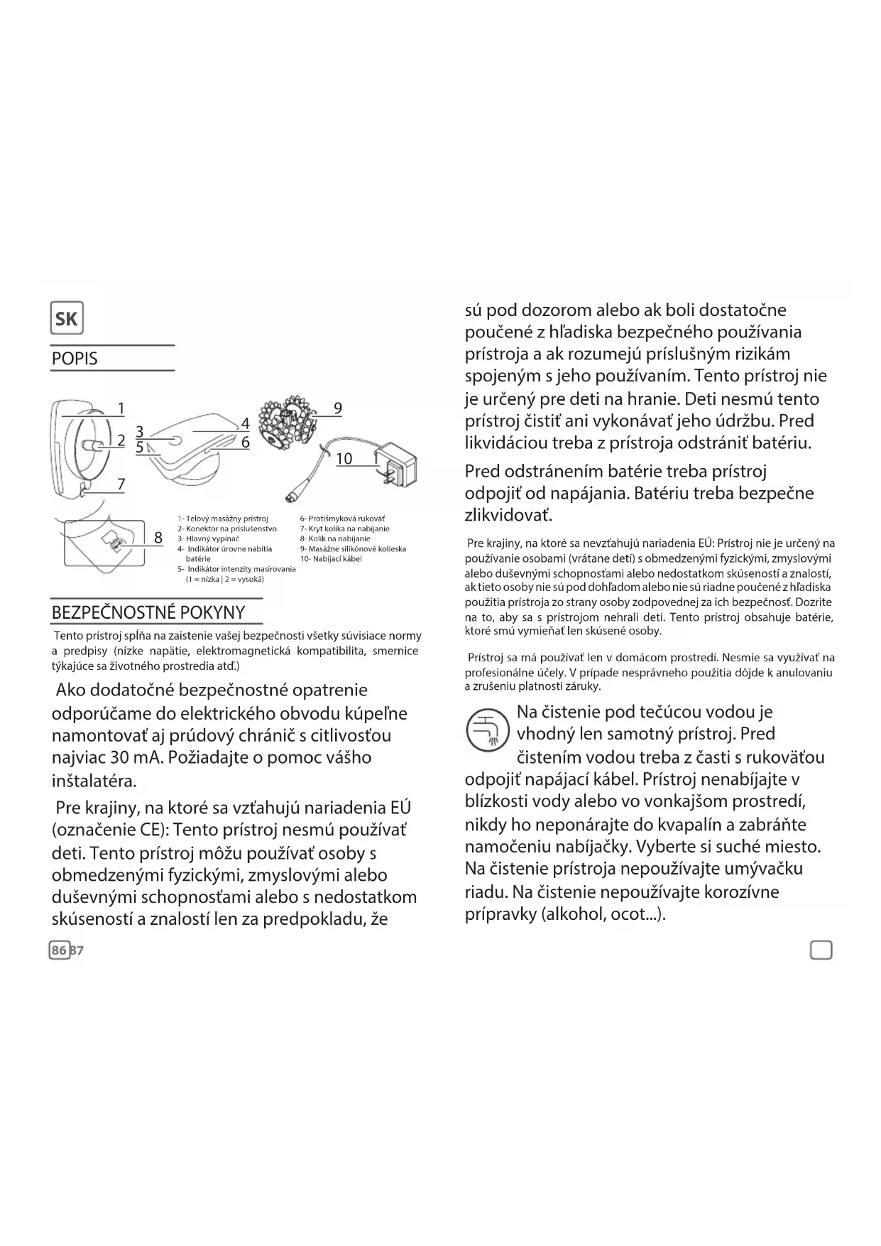 времени. После снижения давления на устройство оно должно перезапуститься автоматически. При наличии другой причины отнесите устройство в сервисный центр.86 87 Tento prístroj spĺňa na zaistenie vašej bezpečnosti všetky súvisiace normy a predpisy (nízke napätie, elektromagnetická kompatibilita, smernice týkajúce sa životného prostredia atď.) Ako dodatočné bezpečnostné opatrenie odporúčame do elektrického obvodu kúpeľne namontovať aj prúdový chránič s citlivosťou najviac 30 mA. Požiadajte o pomoc vášho inštalatéra. Pre krajiny, na ktoré sa vzťahujú nariadenia EÚ (označenie CE): Tento prístroj nesmú používať deti. Tento prístroj môžu používať osoby s obmedzenými fyzickými, zmyslovými alebo duševnými schopnosťami alebo s nedostatkom skúseností a znalostí len za predpokladu, že 1- Telový masážny prístroj2- Konektor na príslušenstvo3- Hlavný vypínač4- Indikátor úrovne nabitia batérie5- Indikátor intenzity masírovania (1 = nízka | 2 = vysoká)6- Protišmyková rukoväť7- Kryt kolíka na nabíjanie8- Kolík na nabíjanie9- Masážne silikónové kolieska 10- Nabíjací kábel