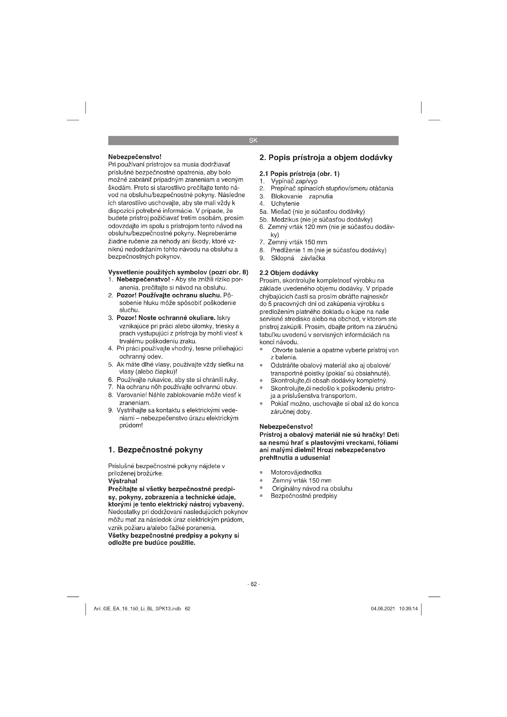 brácie rúk a ramien, pokiaľ sa prístroj bude používať dlhšiu dobu alebo sa nevedie a neudržuje správnym spôsobom. Anl_GE_EA_18_150_Li_BL_SPK13.indb 63Anl_GE_EA_18_150_Li_BL_SPK13.indb 63 04.06.2021 10:39:1404.06.2021 10:39:14SK