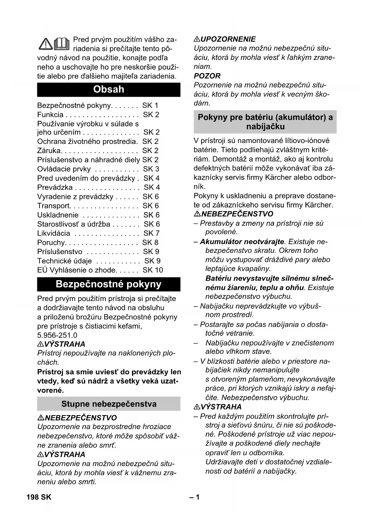 dB(A) 84 Declaraţie UE de conformitate Produs: Aparat de aspirat şi lustruit Tip: 1.783-xxx Directive UE respectate: 2006/42/CE (+2009/127/CE) 2014/30/UE 2011/65/EU 2014/53/EU (TCU) Norme armonizate utilizate: EN 60335–1 EN 60335–2–72 EN 60335-2-29 EN 55012: 2007 + A1: 2009 EN 55014-1:2006 + A1: 2009 + A2:2011 EN 55014–2: 1997 + A1: 2001 + A2: 2008 EN 61000–3–2: 2014 EN 61000–3–3: 2013 EN 61000–6–2: 2005 EN 62233: 2008 EN IEC 63000: 2018 Norme de aplicare naţionale: TCU EN 301 511 V12.5.1 EN 300 440 V2.1.1 EN 300 328 V2.2.2 EN 300 330 V2.1.1 Chairman of the Board of Management Director Regulatory Affairs & Certification 197RO– 1 Pred prvým použitím vášho za- riadenia si prečítajte tento pô- vodný návod na použitie, konajte podľa neho a uschovajte ho pre neskoršie použi- tie alebo pre ďalšieho majiteľa zariadenia. Pred prvým použitím prístroja si prečítajte a dodržiavajte tento návod na obsluhu a priloženú brožúru Bezpečnostné pokyny pre prístroje s čistiacimi kefami, 5.956-251.0 몇 VÝSTRAHA Prístroj nepoužívajte na naklonených plo- chách. Prístroj sa smie uviesť do prevádzky len vtedy, keď sú nádrž a všetky veká uzat- vorené. NEBEZPEČENSTVO Upozornenie na bezprostredne hroziace nebezpečenstvo, ktoré môže spôsobiť váž- ne zranenia alebo smrť. 몇 VÝSTRAHA Upozornenie na možnú nebezpečnú situ- áciu, ktorá by mohla viesť k vážnemu zra- neniu alebo smrti. 몇 UPOZORNENIE Upozornenie na možnú nebezpečnú situ- áciu, ktorá by mohla viesť k ľahkým zrane- niam. POZOR Pozornenie na možnú nebezpečnú situ- áciu, ktorá by mohla viesť k vecným ško- dám. V prístroji sú namontované lítiovo-iónové batérie. Tieto podliehajú zvláštnym krité- riám. Demontáž a montáž, ako aj kontrolu defektných batérií môže vykonávať iba zá- kaznícky servis firmy Kärcher alebo odbor- ník. Pokyny k uskladneniu a preprave dostane- te od zákazníckeho servisu firmy Kärcher. NEBEZPEČENSTVO – Prestavby a zmeny na prístroji nie sú povolené. – Akumulátor neotvárajte. Existuje ne- bezpečenstvo skratu. Okrem toho môžu vystupovať dráždivé pary alebo leptajúce kvapaliny. Batériu nevystavujte silnému slneč- nému žiareniu, teplu a ohňu. Existuje nebezpečenstvo výbuchu. – Nabíjačku neprevádzkujte vo výbuš- nom prostredí. – Postarajte sa počas nabíjania o dosta- točné vetranie. – Nabíjačku nepoužívajte v znečistenom alebo vlhkom stave. – V blízkosti batérie alebo v priestore na- bíjačiek nikdy nemanipulujte s otvoreným plameňom, nevykonávajte práce, pri ktorých vznikajú iskry a nefaj- čite. Nebezpečenstvo výbuchu. 몇 VÝSTRAHA – Pred každým použitím skontrolujte prí- stroj a sieťovú šnúru, či nie sú poškode- né. Poškodené prístroje už viac nepou- žívajte a poškodené diely nechajte opraviť len u odborníka. Udržiavajte deti v dostatočnej vzdiale- nosti od batérií a nabíjačky. Obsah Bezpečnostné pokyny. . . . . . . SK 1 Funkcia . . . . . . . . . . . . . . . . . . SK 2 Používanie výrobku v súlade s jeho určením . . . . . . . . . . . . . . SK 2 Ochrana životného prostredia. SK 2 Záruka. . . . . . . . . . . . . . . . . . . SK 2 Príslušenstvo a náhradné diely SK 2 Ovládacie prvky . . . . . . . . . . . SK 3 Pred uvedením do prevádzky . SK 4 Prevádzka . . . . . . . . . . . . . . . . SK 4 Vyradenie z prevádzky . . . . . . SK 6 Transport. . . . . . . . . . . . . . . . . SK 6 Uskladnenie . . . . . . . . . . . . . . SK 6 Starostlivosť a údržba . . . . . . . SK 6 Likvidácia . . . . . . . . . . . . . . . . SK 7 Poruchy. . . . . . . . . . . . . . . . . . SK 8 Príslušenstvo . . . . . . . . . . . . . SK 9 Technické údaje . . . . . . . . . . . SK 9 EÚ Vyhlásenie o zhode. . . . . . SK 10 Bezpečnostné pokyny Stupne nebezpečenstva Pokyny pre batériu (akumulátor) a nabíjačku 198 SK– 2 Nenabíjajte poškodené batérie. Ne- chajte vymeniť poškodené batérie zá- kazníckemu servisu firmy Kärcher. – Nevyhadzujte defektné batérie do do- mového odpadu, informujte sa u zákaz- níckeho servisu firmy Kärcher. – Zabráňte kontaktu s unikajúcou kvapa- linou poškodenej batérie. Pri náhodnom kontakte opláchnite kvapalinu vodou. Ak sa dostane do očí, poraďte sa s le- károm. 몇 UPOZORNENIE – Tento návod na používanie musíte bez- podmienečne dodržiavať. Rešpektujte odporúčania zákonodarcov o manipulá- cii s batériami. – Sieťové napätie sa musí zhodovať s na- pätím uvedeným na výrobnom štítku prístroja. – Nabíjačku používajte len na nabíjanie schválených batérií. – Akumulátor sa môže prevádzkovať iba s týmto prístrojom, je zakázané a ne- bezpečné jeho používanie na iné účely. Ak sa uvoľní bezpečnostný vypínač, vypne sa pohon kefiek. Tento zametací a vysávací stroj sa používa na čistenie rovných podláh za mokra. Nastavením množstva vody a odsávania znečistenej vody je ho možné ľahko prispô- sobiť príslušnej čistiacej úlohe. Pracovná šírka 350 mm a kapacita nádrže na čistú a špinavú vodu 12 l umožňujú efek- tívne čistenie pri dlhodobom používaní. Pomocou namontovanej nabíjačky je mož- né batérie nabíjať v zásuvke 230 V. Používajte tento stroj výhradne podľa úda- jov v tomto návode na obsluhu. – Tento spotrebič je vhodný na priemy- selné použitie, napr. v hoteloch, ško- lách, nemocniciach, továrňach, obcho- doch, kanceláriách a pre požičovne. – Stroj sa smie používať len na čistenie hladkých podláh, ktoré nie sú chúlostivé na vlhkosť. – Toto zariadenie je určené na používa- nie vo vnútorných priestoroch. – Stroj nie je vhodný na čistenie zmrznu- tých podláh (napr. v chladiarňach). – Stroj sa smie vybaviť len originálnym príslušenstvom a originálnymi náhrad- nými dielmi. Obalové materiály sú recyklovateľné. Obalové m