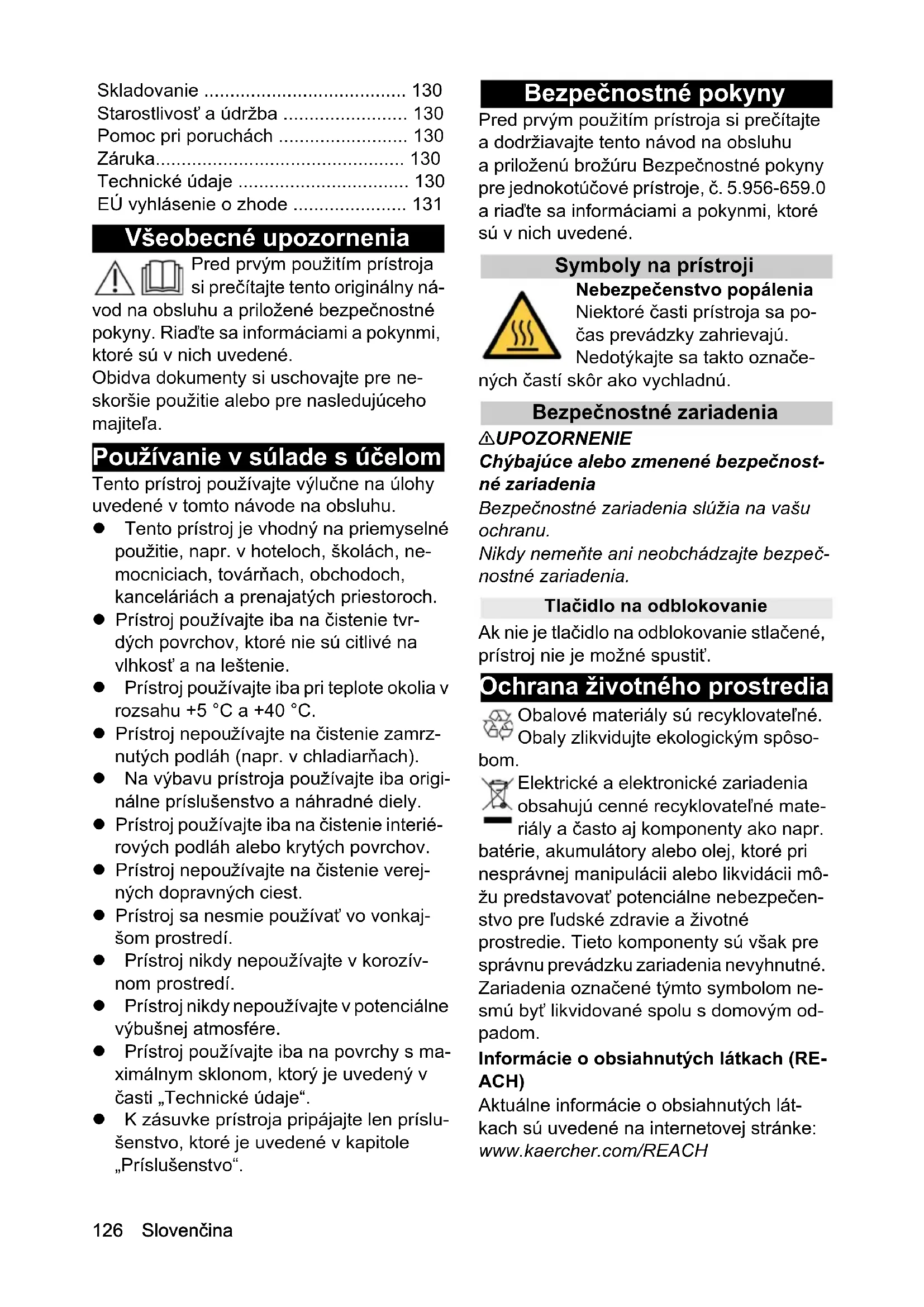 • 26 Slovenčina Všeobecné upozornenia Pred prvým použitím prístroja si prečítajte tento originálny ná- vod na obsluhu a priložené bezpečnostné pokyny. Riaďte sa informáciami a pokynmi, ktoré sú v nich uvedené. Obidva dokumenty si uschovajte pre ne- skoršie použitie alebo pre nasledujúceho majiteľa. Používanie v súlade s účelom Tento prístroj používajte výlučne na úlohy uvedené v tomto návode na obsluhu. Tento prístroj je vhodný na priemyselné použitie, napr. v hoteloch, školách, ne- mocniciach, továrňach, obchodoch, kanceláriách a prenajatých priestoroch. Prístroj používajte iba na čistenie tvr- dých povrchov, ktoré nie sú citlivé na vlhkosť a na leštenie. Prístroj používajte iba pri teplote okolia v rozsahu +5 °C a +40 °C. Prístroj nepoužívajte na čistenie zamrz- nutých podláh (napr. v chladiarňach). Na výbavu prístroja používajte iba origi- nálne príslušenstvo a náhradné diely. Prístroj používajte iba na čistenie interié- rových podláh alebo krytých povrchov. Prístroj nepoužívajte na čistenie verej- ných dopravných ciest. Prístroj sa nesmie používať vo vonkaj- šom prostredí. Prístroj nikdy nepoužívajte v korozív- nom prostredí. Prístroj nikdy nepoužívajte v potenciálne výbušnej atmosfére. Prístroj používajte iba na povrchy s ma- ximálnym sklonom, ktorý je uvedený v časti „Technické údaje“. K zásuvke prístroja pripájajte len príslu- šenstvo, ktoré je uvedené v kapitole „Príslušenstvo“. Bezpečnostné pokyny Pred prvým použitím prístroja si prečítajte a dodržiavajte tento návod na obsluhu a priloženú brožúru Bezpečnostné pokyny pre jednokotúčové prístroje, č. 5.956-659.0 a riaďte sa informáciami a pokynmi, ktoré sú v nich uvedené. Symboly na prístroji Nebezpečenstvo popálenia Niektoré časti prístroja sa po- čas prevádzky zahrievajú. Nedotýkajte sa takto označe- ných častí skôr ako vychladnú. Bezpečnostné zariadenia 몇 UPOZORNENIE Chýbajúce alebo zmenené bezpečnost- né zariadenia Bezpečnostné zariadenia slúžia na vašu ochranu. Nikdy nemeňte ani neobchádzajte bezpeč- nostné zariadenia. Tlačidlo na odblokovanie Ak nie je tlačidlo na odblokovanie stlačené, prístroj nie je možné spustiť. Ochrana životného prostredia Obalové materiály sú recyklovateľné. Obaly zlikvidujte ekologickým spôso- bom. Elektrické a elektronické zariadenia obsahujú cenné recyklovateľné mate- riály a často aj komponenty ako napr. batérie, akumulátory alebo olej, ktoré pri nesprávnej manipulácii alebo likvidácii mô- žu predstavovať potenciálne nebezpečen- stvo pre ľudské zdravie a životné prostredie. Tieto komponenty sú však pre správnu prevádzku zariadenia nevyhnutné. Zariadenia označené týmto symbolom ne- smú byť likvidované spolu s domovým od- padom. Informácie o obsiahnutých látkach (RE- ACH) Aktuálne informácie o obsiahnutých lát- kach sú uvedené na internetovej stránke: www.kaercher.com/REACH Skladovanie p. 130
