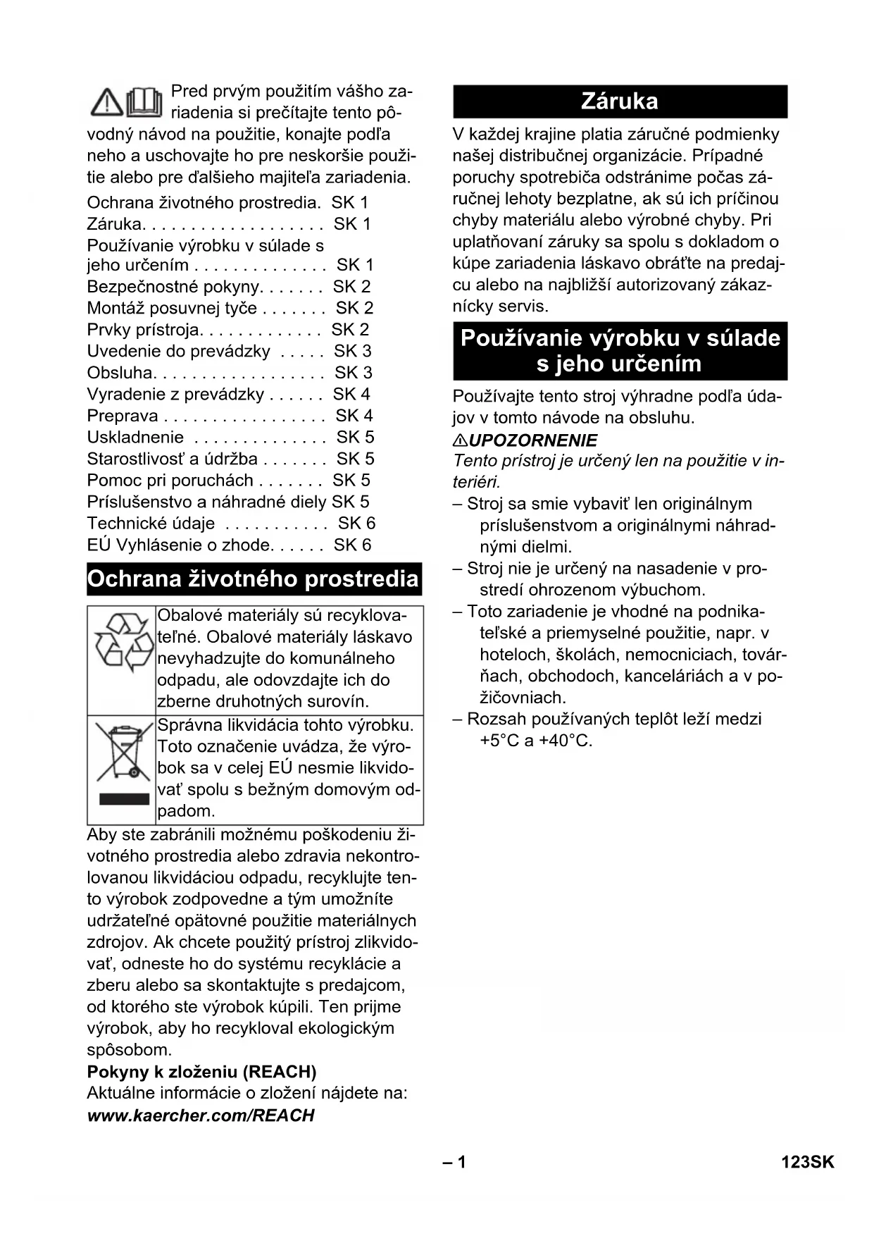 Chairman of the Board of Management Director Regulatory Affairs & Certification 122 RO– 1 Pred prvým použitím vášho za- riadenia si prečítajte tento pô- vodný návod na použitie, konajte podľa neho a uschovajte ho pre neskoršie použi- tie alebo pre ďalšieho majiteľa zariadenia. Aby ste zabránili možnému poškodeniu ži- votného prostredia alebo zdravia nekontro- lovanou likvidáciou odpadu, recyklujte ten- to výrobok zodpovedne a tým umožníte udržateľné opätovné použitie materiálnych zdrojov. Ak chcete použitý prístroj zlikvido- vať, odneste ho do systému recyklácie a zberu alebo sa skontaktujte s predajcom, od ktorého ste výrobok kúpili. Ten prijme výrobok, aby ho recykloval ekologickým spôsobom. Pokyny k zloženiu (REACH) Aktuálne informácie o zložení nájdete na: www.kaercher.com/REACH V každej krajine platia záručné podmienky našej distribučnej organizácie. Prípadné poruchy spotrebiča odstránime počas zá- ručnej lehoty bezplatne, ak sú ich príčinou chyby materiálu alebo výrobné chyby. Pri uplatňovaní záruky sa spolu s dokladom o kúpe zariadenia láskavo obráťte na predaj- cu alebo na najbližší autorizovaný zákaz- nícky servis. Používajte tento stroj výhradne podľa úda- jov v tomto návode na obsluhu. 몇 UPOZORNENIE Tento prístroj je určený len na použitie v in- teriéri. – Stroj sa smie vybaviť len originálnym príslušenstvom a originálnymi náhrad- nými dielmi. – Stroj nie je určený na nasadenie v pro- stredí ohrozenom výbuchom. – Toto zariadenie je vhodné na podnika- teľské a priemyselné použitie, napr. v hoteloch, školách, nemocniciach, továr- ňach, obchodoch, kanceláriách a v po- žičovniach. – Rozsah používaných teplôt leží medzi +5°C a +40°C. Ochrana životného prostredia. SK 1 Záruka. . . . . . . . . . . . . . . . . . . SK 1 Používanie výrobku v súlade s jeho určením . . . . . . . . . . . . . . SK 1 Bezpečnostné pokyny. . . . . . . SK 2 Montáž posuvnej tyče . . . . . . . SK 2 Prvky prístroja. . . . . . . . . . . . . SK 2 Uvedenie do prevádzky . . . . . SK 3 Obsluha. . . . . . . . . . . . . . . . . . SK 3 Vyradenie z prevádzky . . . . . . SK 4 Preprava . . . . . . . . . . . . . . . . . SK 4 Uskladnenie . . . . . . . . . . . . . . SK 5 Starostlivosť a údržba . . . . . . . SK 5 Pomoc pri poruchách . . . . . . . SK 5 Príslušenstvo a náhradné diely SK 5 Technické údaje . . . . . . . . . . . SK 6 EÚ Vyhlásenie o zhode. . . . . . SK 6 Ochrana životného prostredia Obalové materiály sú recyklova- teľné. Obalové materiály láskavo nevyhadzujte do komunálneho odpadu, ale odovzdajte ich do zberne druhotných surovín. Správna likvidácia tohto výrobku. Toto označenie uvádza, že výro- bok sa v celej EÚ nesmie likvido- vať spolu s bežným domovým od- padom. Záruka Používanie výrobku v súlade s jeho určením 123SK– 2 Pred prvým použitím zariadenia si prečítaj- te a dodržujte tento návod na obsluhu a pri- loženú brožúru Bezpečnostné pokyny pre jednokotúčové zariadenia č. 5.956-659 a podľa toho aj jednajte. NEBEZPEČENSTVO Upozornenie na bezprostredne hroziace nebezpečenstvo, ktoré môže spôsobiť váž- ne zranenia alebo smrť. 몇 VÝSTRAHA Upozornenie na možnú nebezpečnú situ- áciu, ktorá by mohla viesť k vážnemu zra- neniu alebo smrti. 몇 UPOZORNENIE Upozornenie na možnú nebezpečnú situ- áciu, ktorá by mohla viesť k ľahkým zrane- niam. POZOR Pozornenie na možnú nebezpečnú situ- áciu, ktorá by mohla viesť k vecným ško- dám. Bezpečnostné zariadenia slúžia na ochra- nu používateľa. Nesmú sa vyraďovať z pre- vádzky a ich funkciu nemožno obísť. Zabráni neúmyselnému zapnutiu prístroja. Ak chcete prístroj zapnúť, stlačte tlačidlo na odblokovanie a potom zapínač/vypínač. Pred uvedením do prevádzky sa musí po- suvná tyč namontovať tak, ako je to znázor- nené na obrázku, a musí sa vytvoriť elek- trické pripojenie k prístroju. Obrázok pozri na titulnej strane Na obrázku je zobrazený prístroj BDS 43/ 150 C Classic. Prístroj BDS 43/Duo C sa od neho mierne líši. 1 Unášač, kotúčová kefka / Rotačný ta- nier s vložkou 2 Hnacia platňa kefy/podložky 3 Dávkovacia páčka roztoku čistiaceho prostriedku (voľba) 4 Vypínač ZAP / VYP 5 Hák na kábel 6 Tlačidlo na odblokovanie 7 Rukovät' 8 Páka na nastavenie sklonu 9 Poistka pohonu kief 10 Zásuvka príslušenstva 11 Nádrž na čistiaci prostriedok (voľba) 12 Skriňa motora 13 Spínač otáčok kefy (iba BDS 43/Duo C) ** nie je obsahom dodávky Bezpečnostné pokyny Stupne nebezpečenstva Bezpečnostné prvky Zablokovanie Montáž posuvnej tyče Prvky prístroja