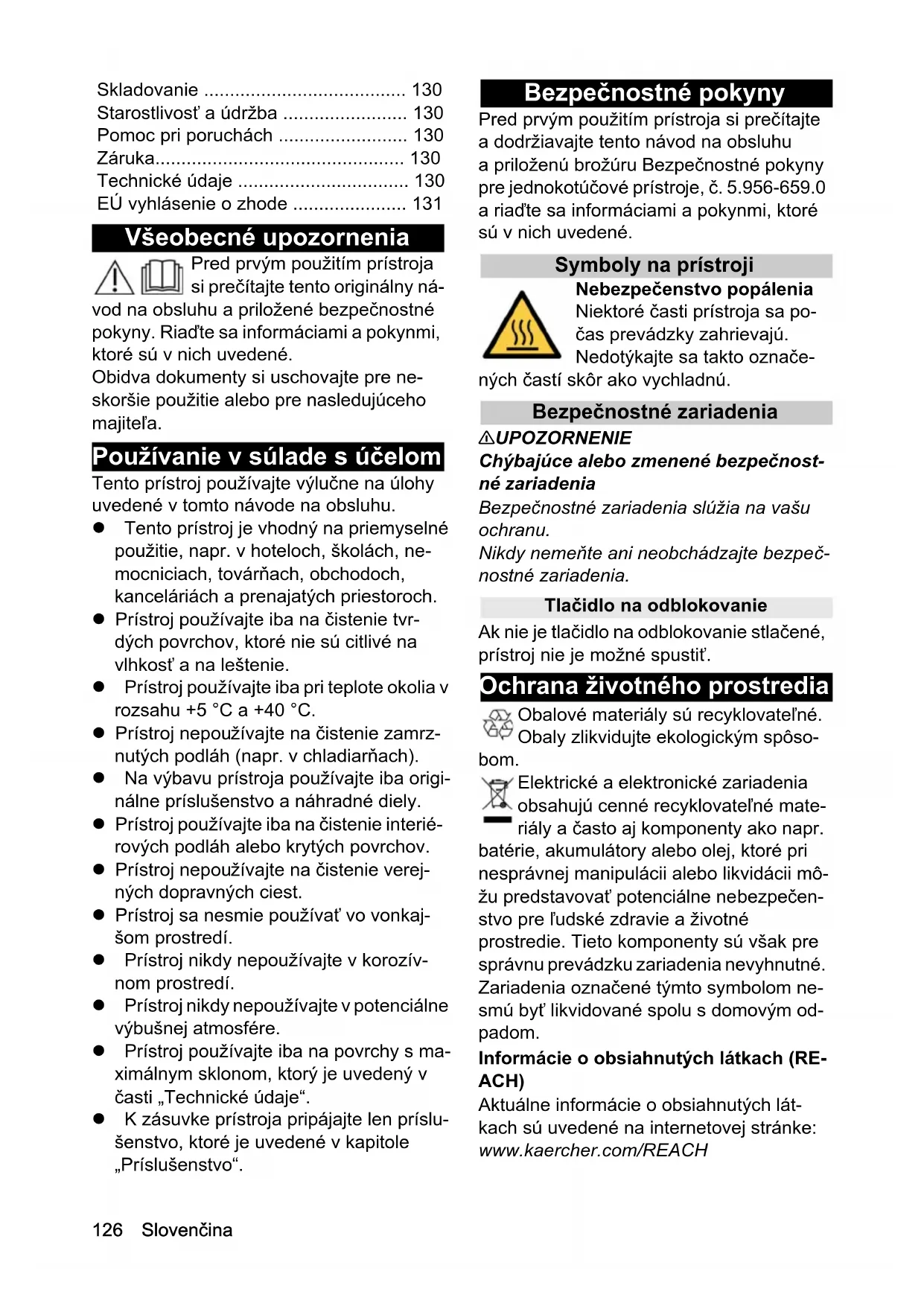 - 26 Slovenčina Všeobecné upozornenia Pred prvým použitím prístroja si prečítajte tento originálny ná- vod na obsluhu a priložené bezpečnostné pokyny. Riaďte sa informáciami a pokynmi, ktoré sú v nich uvedené. Obidva dokumenty si uschovajte pre ne- skoršie použitie alebo pre nasledujúceho majiteľa. Používanie v súlade s účelom Tento prístroj používajte výlučne na úlohy uvedené v tomto návode na obsluhu. Tento prístroj je vhodný na priemyselné použitie, napr. v hoteloch, školách, ne- mocniciach, továrňach, obchodoch, kanceláriách a prenajatých priestoroch. Prístroj používajte iba na čistenie tvr- dých povrchov, ktoré nie sú citlivé na vlhkosť a na leštenie. Prístroj používajte iba pri teplote okolia v rozsahu +5 °C a +40 °C. Prístroj nepoužívajte na čistenie zamrz- nutých podláh (napr. v chladiarňach). Na výbavu prístroja používajte iba origi- nálne príslušenstvo a náhradné diely. Prístroj používajte iba na čistenie interié- rových podláh alebo krytých povrchov. Prístroj nepoužívajte na čistenie verej- ných dopravných ciest. Prístroj sa nesmie používať vo vonkaj- šom prostredí. Prístroj nikdy nepoužívajte v korozív- nom prostredí. Prístroj nikdy nepoužívajte v potenciálne výbušnej atmosfére. Prístroj používajte iba na povrchy s ma- ximálnym sklonom, ktorý je uvedený v časti „Technické údaje“. K zásuvke prístroja pripájajte len príslu- šenstvo, ktoré je uvedené v kapitole „Príslušenstvo“. Bezpečnostné pokyny Pred prvým použitím prístroja si prečítajte a dodržiavajte tento návod na obsluhu a priloženú brožúru Bezpečnostné pokyny pre jednokotúčové prístroje, č. 5.956-659.0 a riaďte sa informáciami a pokynmi, ktoré sú v nich uvedené. Symboly na prístroji Nebezpečenstvo popálenia Niektoré časti prístroja sa po- čas prevádzky zahrievajú. Nedotýkajte sa takto označe- ných častí skôr ako vychladnú. Bezpečnostné zariadenia 몇 UPOZORNENIE Chýbajúce alebo zmenené bezpečnost- né zariadenia Bezpečnostné zariadenia slúžia na vašu ochranu. Nikdy nemeňte ani neobchádzajte bezpeč- nostné zariadenia. Tlačidlo na odblokovanie Ak nie je tlačidlo na odblokovanie stlačené, prístroj nie je možné spustiť. Ochrana životného prostredia Obalové materiály sú recyklovateľné. Obaly zlikvidujte ekologickým spôso- bom. Elektrické a elektronické zariadenia obsahujú cenné recyklovateľné mate- riály a často aj komponenty ako napr. batérie, akumulátory alebo olej, ktoré pri nesprávnej manipulácii alebo likvidácii mô- žu predstavovať potenciálne nebezpečen- stvo pre ľudské zdravie a životné prostredie. Tieto komponenty sú však pre správnu prevádzku zariadenia nevyhnutné. Zariadenia označené týmto symbolom ne- smú byť likvidované spolu s domovým od- padom. Informácie o obsiahnutých látkach (RE- ACH) Aktuálne informácie o obsiahnutých lát- kach sú uvedené na internetovej stránke: www.kaercher.com/REACH Skladovanie p. 130