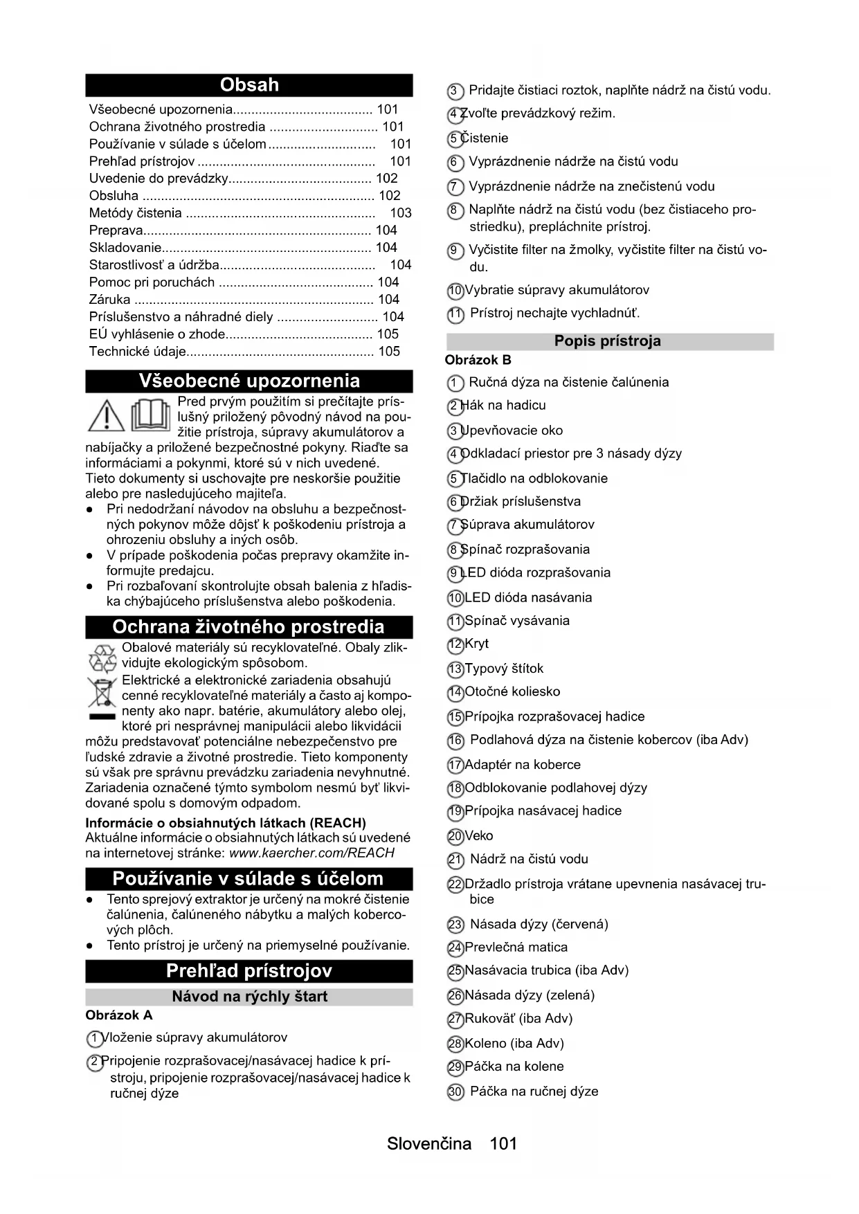 - 0,2Slovenčina 101 Obsah Všeobecné upozornenia Pred prvým použitím si prečítajte prís- lušný priložený pôvodný návod na pou- žitie prístroja, súpravy akumulátorov a nabíjačky a priložené bezpečnostné pokyny. Riaďte sa informáciami a pokynmi, ktoré sú v nich uvedené. Tieto dokumenty si uschovajte pre neskoršie použitie alebo pre nasledujúceho majiteľa. ● Pri nedodržaní návodov na obsluhu a bezpečnost- ných pokynov môže dôjsť k poškodeniu prístroja a ohrozeniu obsluhy a iných osôb. ● V prípade poškodenia počas prepravy okamžite in- formujte predajcu. ● Pri rozbaľovaní skontrolujte obsah balenia z hľadis- ka chýbajúceho príslušenstva alebo poškodenia. Ochrana životného prostredia Obalové materiály sú recyklovateľné. Obaly zlik- vidujte ekologickým spôsobom. Elektrické a elektronické zariadenia obsahujú cenné recyklovateľné materiály a často aj kompo- nenty ako napr. batérie, akumulátory alebo olej, ktoré pri nesprávnej manipulácii alebo likvidácii môžu predstavovať potenciálne nebezpečenstvo pre ľudské zdravie a životné prostredie. Tieto komponenty sú však pre správnu prevádzku zariadenia nevyhnutné. Zariadenia označené týmto symbolom nesmú byť likvi- dované spolu s domovým odpadom. Informácie o obsiahnutých látkach (REACH) Aktuálne informácie o obsiahnutých látkach sú uvedené na internetovej stránke: www.kaercher.com/REACH Používanie v súlade s účelom ● Tento sprejový extraktor je určený na mokré čistenie čalúnenia, čalúneného nábytku a malých koberco- vých plôch. ● Tento prístroj je určený na priemyselné používanie. Prehľad prístrojov Návod na rýchly štart Obrázok A 1 Vloženie súpravy akumulátorov 2 Pripojenie rozprašovacej/nasávacej hadice k prí- stroju, pripojenie rozprašovacej/nasávacej hadice k ručnej dýze 3 Pridajte čistiaci roztok, naplňte nádrž na čistú vodu. 4 Zvoľte prevádzkový režim. 5 Čistenie 6 Vyprázdnenie nádrže na čistú vodu 7 Vyprázdnenie nádrže na znečistenú vodu 8 Naplňte nádrž na čistú vodu (bez čistiaceho pro- striedku), prepláchnite prístroj. 9 Vyčistite filter na žmolky, vyčistite filter na čistú vo- du. 10 Vybratie súpravy akumulátorov 11 Prístroj nechajte vychladnúť. Popis prístroja Obrázok B 1 Ručná dýza na čistenie čalúnenia 2 Hák na hadicu 3 Upevňovacie oko 4 Odkladací priestor pre 3 násady dýzy 5 Tlačidlo na odblokovanie 6 Držiak príslušenstva 7 Súprava akumulátorov 8 Spínač rozprašovania 9 LED dióda rozprašovania 10 LED dióda nasávania 11 Spínač vysávania 12 Kryt 13 Typový štítok 14 Otočné koliesko 15 Prípojka rozprašovacej hadice 16 Podlahová dýza na čistenie kobercov (iba Adv) 17 Adaptér na koberce 18 Odblokovanie podlahovej dýzy 19 Prípojka nasávacej hadice 20 Veko 21 Nádrž na čistú vodu 22 Držadlo prístroja vrátane upevnenia nasávacej tru- bice 23 Násada dýzy (červená) 24 Prevlečná matica 25 Nasávacia trubica (iba Adv) 26 Násada dýzy (zelená) 27 Rukoväť (iba Adv) 28 Koleno (iba Adv) 29 Páčka na kolene 30 Páčka na ručnej dýze Všeobecné upozornenia p. 101