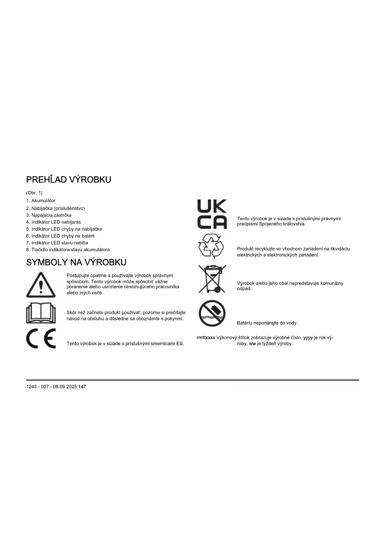 Postupujte opatrne apoužívajte výrobok správnym spôsobom. Tento výrobok môže spôsobiť vážne poranenie alebo usmrtenie obsluhujúceho pracovníka alebo iných osôb. Skôr než začnete produkt používať, pozorne si prečítajte návod na obsluhu adôsledne sa oboznámte spokynmi. Tento výrobok je vsúlade spríslušnými smernicami ES. Tento výrobok je vsúlade spríslušnými právnymi predpismi Spojeného kráľovstva. Produkt recyklujte vo vhodnom zariadení na likvidáciu elektrických aelektronických zariadení. Výrobok alebo jeho obal nepredstavuje komunálny odpad. Batériu neponárajte do vody. rrrrttxxxx Výkonový štítok zobrazuje výrobné číslo. yyyy je rok vý- roby, ww je týždeň výroby. 1243 - 007 - 08.09.2025 147Poznámka: Ostatné symboly/emblémy na výrobku odkazujú na požiadavky certifikácie pre niektoré komerčné oblasti. Poškodenie výrobku Nie sme zodpovední za škody na našom výrobku v prípade: