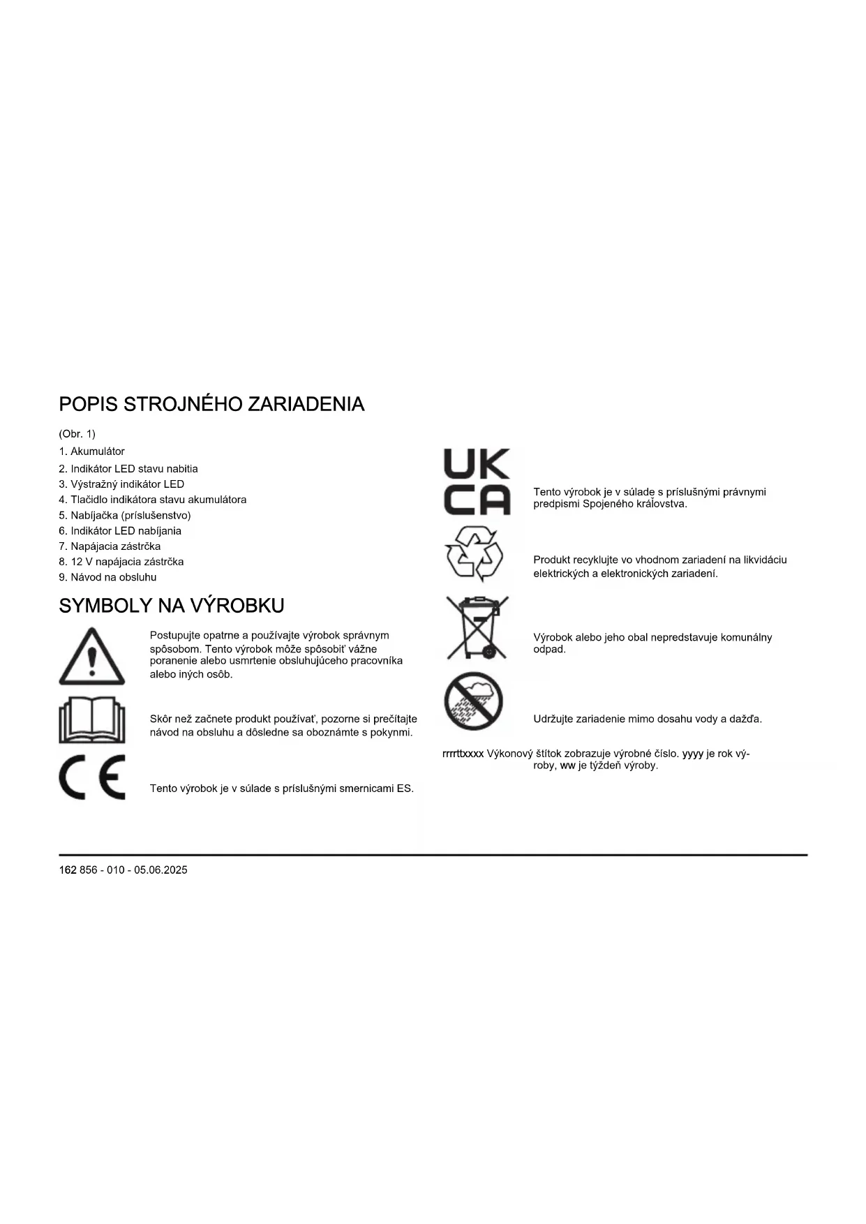 Postupujte opatrne apoužívajte výrobok správnym spôsobom. Tento výrobok môže spôsobiť vážne poranenie alebo usmrtenie obsluhujúceho pracovníka alebo iných osôb. Skôr než začnete produkt používať, pozorne si prečítajte návod na obsluhu adôsledne sa oboznámte spokynmi. Tento výrobok je vsúlade spríslušnými smernicami ES. Tento výrobok je vsúlade spríslušnými právnymi predpismi Spojeného kráľovstva. Produkt recyklujte vo vhodnom zariadení na likvidáciu elektrických aelektronických zariadení. Výrobok alebo jeho obal nepredstavuje komunálny odpad. Udržujte zariadenie mimo dosahu vody a dažďa. rrrrttxxxx Výkonový štítok zobrazuje výrobné číslo. yyyy je rok vý- roby, ww je týždeň výroby. 162 856 - 010 - 05.06.2025Poznámka: Ostatné symboly/emblémy na výrobku odkazujú na požiadavky certifikácie pre niektoré komerčné oblasti. Poškodenie výrobku Nie sme zodpovední za škody na našom výrobku v prípade: