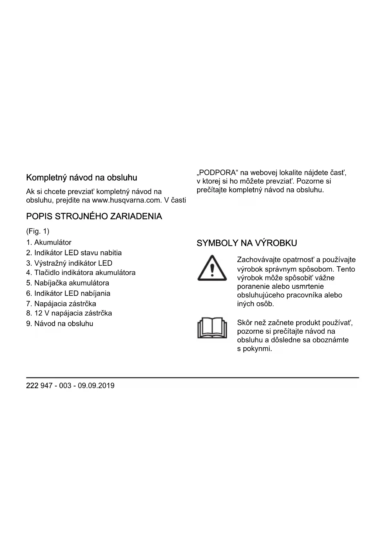Zachovávajte opatrnosť a používajte výrobok správnym spôsobom. Tento výrobok môže spôsobiť vážne poranenie alebo usmrtenie obsluhujúceho pracovníka alebo iných osôb. Skôr než začnete produkt používať, pozorne si prečítajte návod na obsluhu a dôsledne sa oboznámte s pokynmi. 222 947 - 003 - 09.09.2019Tento výrobok je v súlade s príslušnými smernicami ES. Výrobok alebo jeho obal nepredstavuje komunálny odpad. Recyklujte ho vo vhodnom zariadení na likvidáciu elektrických a elektronických zariadení. Udržujte zariadenie mimo dosahu vody a dažďa. Nabíjačku batérie používajte a skladuje len v interiéri. Poznámka: Ostatné symboly/emblémy na výrobku odkazujú na požiadavky certifikácie pre niektoré komerčné oblasti.