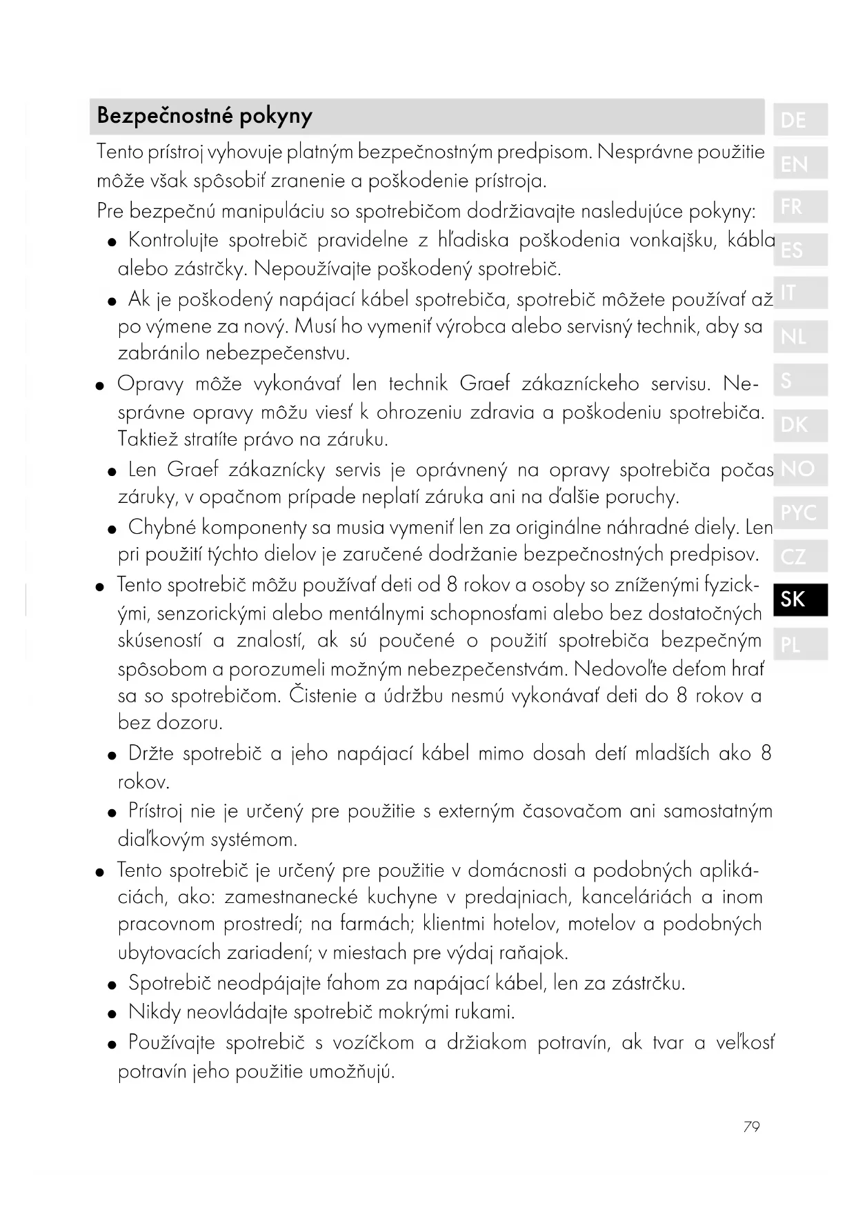 Bezpečnostné pokyny Tento prístroj vyhovuje platným bezpečnostným predpisom. Nesprávne použitie môže však spôsobiť zranenie a poškodenie prístroja. Pre bezpečnú manipuláciu so spotrebičom dodržiavajte nasledujúce pokyny: ● Kontrolujte spotrebič pravidelne z hľadiska poškodenia vonkajšku, kábla alebo zástrčky. Nepoužívajte poškodený spotrebič. ● Ak je poškodený napájací kábel spotrebiča, spotrebič môžete používať až po výmene za nový. Musí ho vymeniť výrobca alebo servisný technik, aby sa zabránilo nebezpečenstvu. ● Opravy môže vykonávať len technik Graef zákazníckeho servisu. Ne- správne opravy môžu viesť k ohrozeniu zdravia a poškodeniu spotrebiča. Taktiež stratíte právo na záruku. ● Len Graef zákaznícky servis je oprávnený na opravy spotrebiča počas záruky, v opačnom prípade neplatí záruka ani na ďalšie poruchy. ● Chybné komponenty sa musia vymeniť len za originálne náhradné diely. Len pri použití týchto dielov je zaručené dodržanie bezpečnostných predpisov. ● Tento spotrebič môžu používať deti od 8 rokov a osoby so zníženými fyzick- ými, senzorickými alebo mentálnymi schopnosťami alebo bez dostatočných skúseností a znalostí, ak sú poučené o použití spotrebiča bezpečným spôsobom a porozumeli možným nebezpečenstvám. Nedovoľte deťom hrať sa so spotrebičom. Čistenie a údržbu nesmú vykonávať deti do 8 rokov a bez dozoru. ● Držte spotrebič a jeho napájací kábel mimo dosah detí mladších ako 8 rokov. ● Prístroj nie je určený pre použitie s externým časovačom ani samostatným diaľkovým systémom. ● Tento spotrebič je určený pre použitie v domácnosti a podobných apliká- ciách, ako: zamestnanecké kuchyne v predajniach, kanceláriách a inom pracovnom prostredí; na farmách; klientmi hotelov, motelov a podobných ubytovacích zariadení; v miestach pre výdaj raňajok. ● Spotrebič neodpájajte ťahom za napájací kábel, len za zástrčku. ● Nikdy neovládajte spotrebič mokrými rukami. ● Používajte spotrebič s vozíčkom a držiakom potravín, ak tvar a veľkosť potravín jeho použitie umožňujú.80 ● V pohotovostnom režime otočte ovládač v smere hodinových ručičiek za pozíciu nula až do konca tak, aby stop pozícia prekryla nôž. ● Nepoužívajte obalové materiály ako hračku. Riziko udusenia. ● Nedotýkajte sa noža prstami. Je veľmi ostrý a môže spôsobiť vážne zranenia. ● Uistite sa, či je spotrebič vypnutý a odpojený od elektrickej siete. ● Skontrolujte, či je stop pozícia zatvorená (nôž je prekrytý). ● Nepoužívajte agresívne ani drsné čističe a nepoužívajte rozpúšťadlá. ● Neoškrabujte odolné nečistoty ostrými predmetmi. ● Neumývajte spotrebič vo vode ani ho neponárajte do vody. Požadavky pro místo instalace Pro bezpečnou obsluhu prístroje musí místo postavení odpovídat následujícím požadavkům: ● Spotrebič postavte na pevný, rovný, plochý a protišmykový povrch, ktorý znesie hmotnosť spotrebiča. ● Zvoľte pozíciu, kde nedosiahnu deti na ostrý nôž. Možné riziko Rotujúci nôž vás môže zraniť. Prsty, hlavne palce sú ohrozené. Z tohto dôvodu nikdy nesiahajte do priestoru medzi stop pozíciou a držiakom krájaného ma- teriálu, ak nie je stop pozícia úplne zatvorená, napr., pod hodnotu “0”. Krájanie ● Natočte nožičku spotrebiča, kým to ide (1.1). ● Nasuňte posúvač na spodnú stranu vozíka a vozíček obráťte (2.1). ● Dajte ochranu prstov do horizontálnej pozície (2.2). ● Položte krájané potraviny na vozíček. ● Nastavte požadovanú hrúbku krájania pomocou ručného ovládača (3.2). ● Stlačte požadovaný spínač „Pulzný“ alebo „Trvalý“ (3.1). ● Tlačte na krájané pokrmy jemne proti stop pozícii a veďte vozíček rovnomer- ne proti nožu (3.3). ● Po skončení krájania spotrebič vypnite. ● Stlačte tlačidlo na strane ochrany prstov a sklopte (6.1). ● Zatlačte posúvač na opačnú stranu vozíčka a vyklopte (6.2). Dôležité81