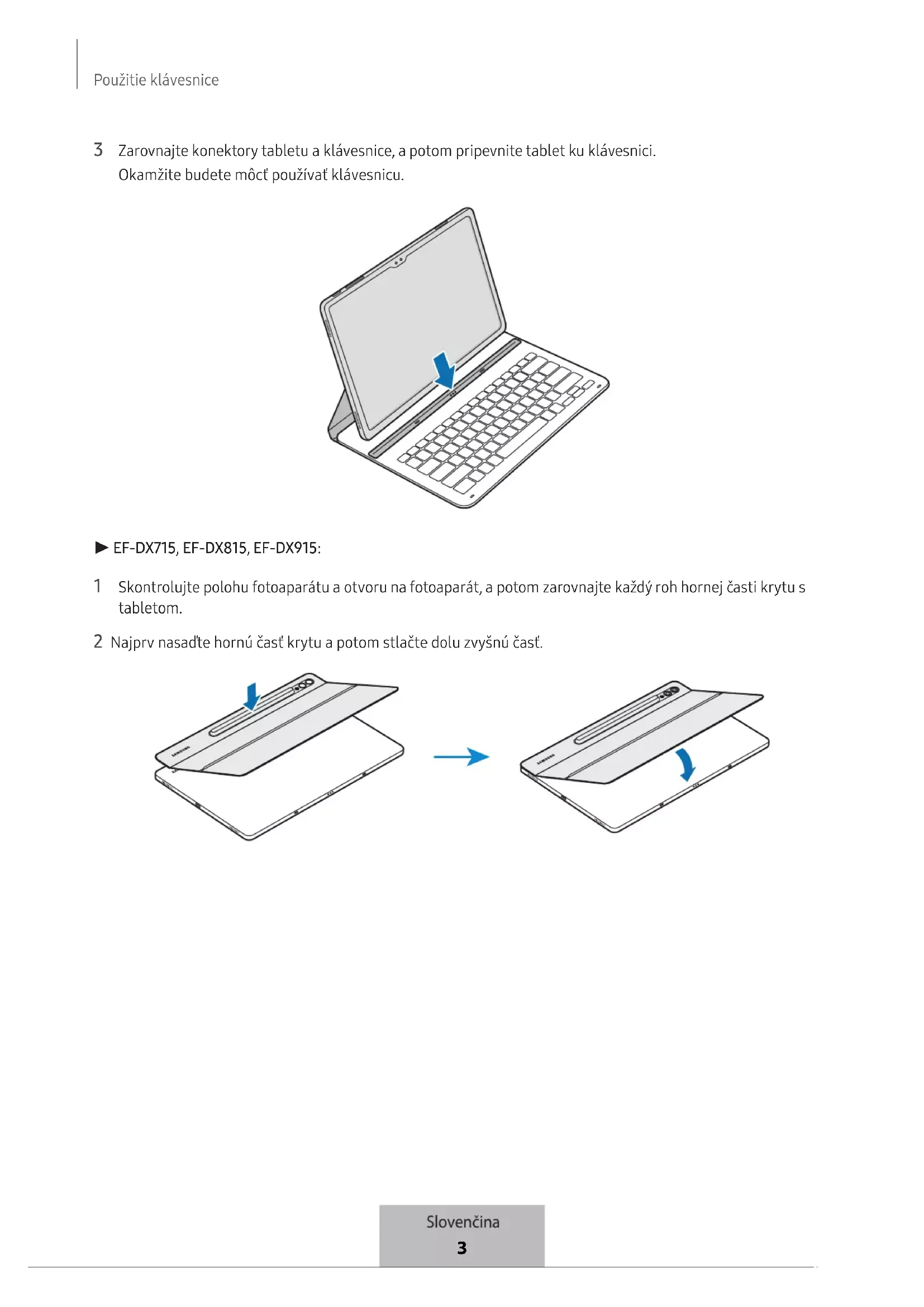 EF-DX715, EF-DX815, EF-DX915: 1 Skontrolujte polohu fotoaparátu a otvoru na fotoaparát, a potom zarovnajte každý roh hornej časti krytu s tabletom. 2 Najprv nasaďte hornú časť krytu a potom stlačte dolu zvyšnú časť. Slovenčina 3Použitie klávesnice