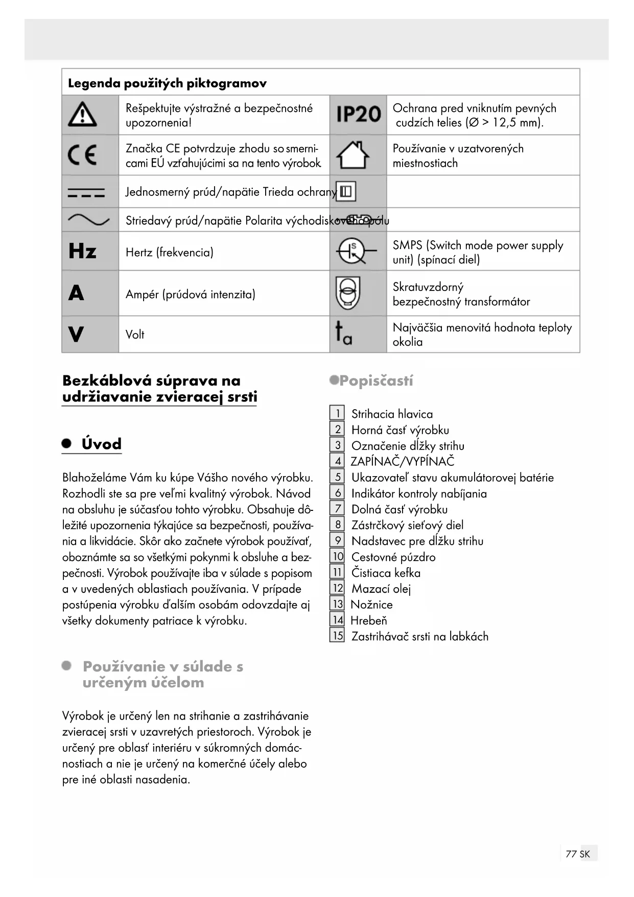 Volt Najväčšia menovitá hodnota teploty okolia Bezkáblová súprava na udržiavanie zvieracej srsti Úvod Blahoželáme Vám ku kúpe Vášho nového výrobku. Rozhodli ste sa pre veľmi kvalitný výrobok. Návod na obsluhu je súčasťou tohto výrobku. Obsahuje dô- ležité upozornenia týkajúce sa bezpečnosti, používa- nia a likvidácie. Skôr ako začnete výrobok používať, oboznámte sa so všetkými pokynmi k obsluhe a bez- pečnosti. Výrobok používajte iba v súlade s popisom a v uvedených oblastiach používania. V prípade postúpenia výrobku ďalším osobám odovzdajte aj všetky dokumenty patriace k výrobku. Používanie v súlade s určeným účelom Výrobok je určený len na strihanie a zastrihávanie zvieracej srsti v uzavretých priestoroch. Výrobok je určený pre oblasť interiéru v súkromných domác- nostiach a nie je určený na komerčné účely alebo pre iné oblasti nasadenia. Popis častí