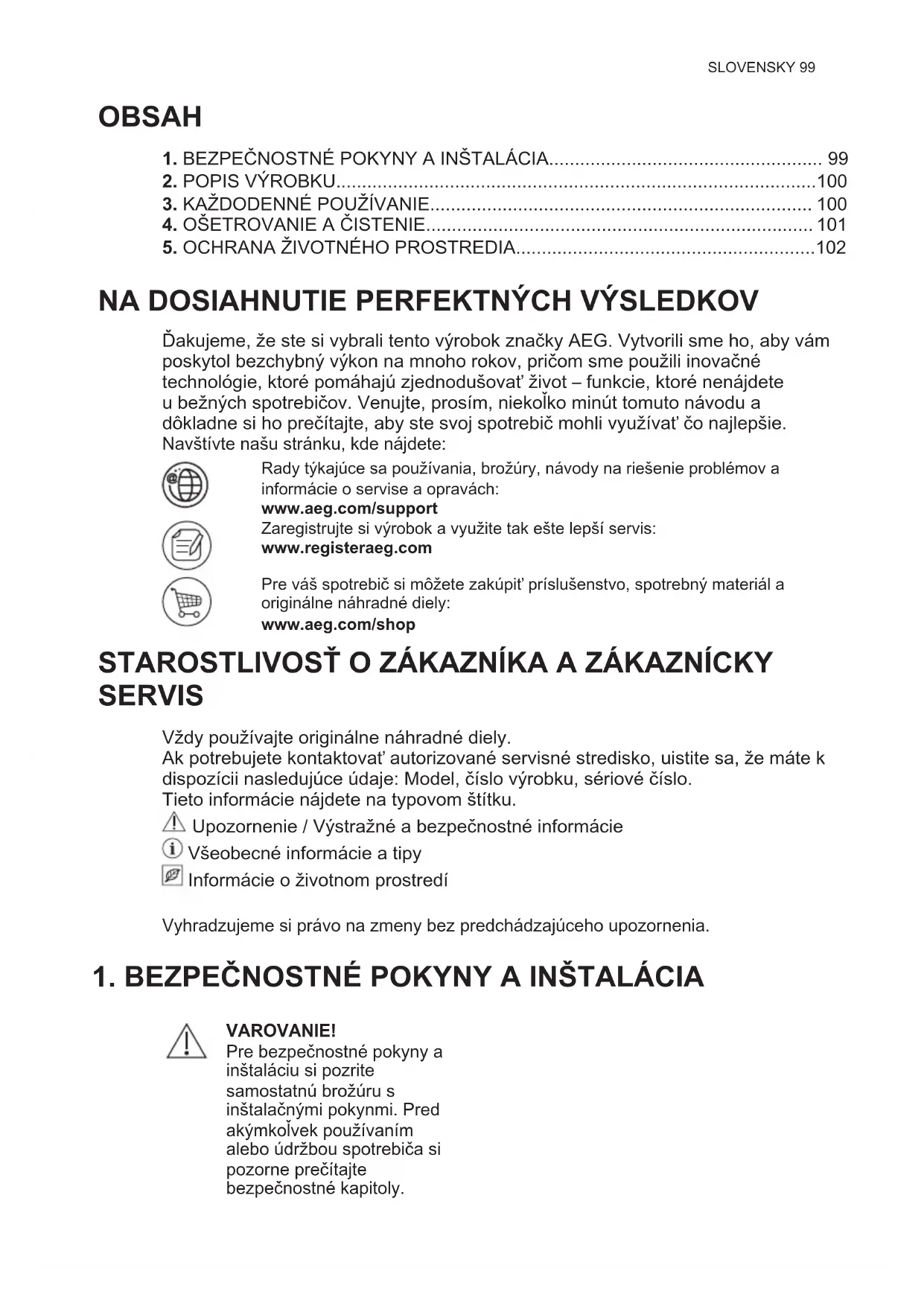 Ďakujeme, že ste si vybrali tento výrobok značky AEG. Vytvorili sme ho, aby vám poskytol bezchybný výkon na mnoho rokov, pričom sme použili inovačné technológie, ktoré pomáhajú zjednodušovať život – funkcie, ktoré nenájdete u bežných spotrebičov. Venujte, prosím, niekoľko minút tomuto návodu a dôkladne si ho prečítajte, aby ste svoj spotrebič mohli využívať čo najlepšie. Navštívte našu stránku, kde nájdete: Rady týkajúce sa používania, brožúry, návody na riešenie problémov a informácie o servise a opravách: www.aeg.com/support Zaregistrujte si výrobok a využite tak ešte lepší servis: www.registeraeg.com Pre váš spotrebič si môžete zakúpiť príslušenstvo, spotrebný materiál a originálne náhradné diely: www.aeg.com/shop STAROSTLIVOSŤ O ZÁKAZNÍKA A ZÁKAZNÍCKY SERVIS Vždy používajte originálne náhradné diely. Ak potrebujete kontaktovať autorizované servisné stredisko, uistite sa, že máte k dispozícii nasledujúce údaje: Model, číslo výrobku, sériové číslo. Tieto informácie nájdete na typovom štítku. Upozornenie / Výstražné a bezpečnostné informácie Všeobecné informácie a tipy Informácie o životnom prostredí Vyhradzujeme si právo na zmeny bez predchádzajúceho upozornenia.