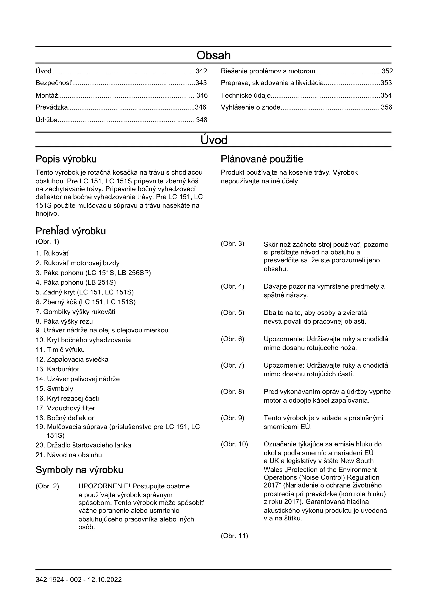 Symboly na výrobku (Obr. 2) UPOZORNENIE! Postupujte opatrne apoužívajte výrobok správnym spôsobom. Tento výrobok môže spôsobiť vážne poranenie alebo usmrtenie obsluhujúceho pracovníka alebo iných osôb. (Obr. 3) Skôr než začnete stroj používať, pozorne si prečítajte návod na obsluhu a presvedčite sa, že ste porozumeli jeho obsahu. (Obr. 4) Dávajte pozor na vymrštené predmety a spätné nárazy. (Obr. 5) Dbajte na to, aby osoby a zvieratá nevstupovali do pracovnej oblasti. (Obr. 6) Upozornenie: Udržiavajte ruky a chodidlá mimo dosahu rotujúceho noža. (Obr. 7) Upozornenie: Udržiavajte ruky a chodidlá mimo dosahu rotujúcich častí. (Obr. 8) Pred vykonávaním opráv a údržby vypnite motor a odpojte kábel zapaľovania. (Obr. 9) Tento výrobok je vsúlade spríslušnými smernicami EÚ. (Obr. 10) Označenie týkajúce sa emisie hluku do okolia podľa smerníc anariadení EÚ a UK alegislatívy vštáte New South Wales „Protection of the Environment Operations (Noise Control) Regulation 2017“ (Nariadenie oochrane životného prostredia pri prevádzke (kontrola hluku) zroku 2017). Garantovaná hladina akustického výkonu produktu je uvedená v ana štítku. (Obr. 11) 342 1924 - 002 - 12.10.2022Tento výrobok je vsúlade spríslušnými právnymi predpismi Spojeného kráľovstva. (Obr. 12) Hrozí nebezpečenstvo požiaru. (Obr. 13) Nevdychujte výfukové plyny. Výfukové plyny z motora obsahujú oxid uhoľnatý, plyn bez zápachu, ktorý je jedovatý a veľmi nebezpečný. Motor neštartujte vinteriéri ani vuzavretých priestoroch. (Obr. 14) Horúci povrch. (Obr. 15) Pred štartovaním výrobku na- plňte motor olejom. Poznámka: Ostatné symboly/emblémy na výrobku odkazujú na požiadavky certifikácie pre niektoré komerčné oblasti. Zodpovednosť za výrobok Vsúlade správnymi predpismi upravujúcimi zodpovednosť za výrobok nenesieme zodpovednosť za škody spôsobené naším výrobkom vdôsledku: