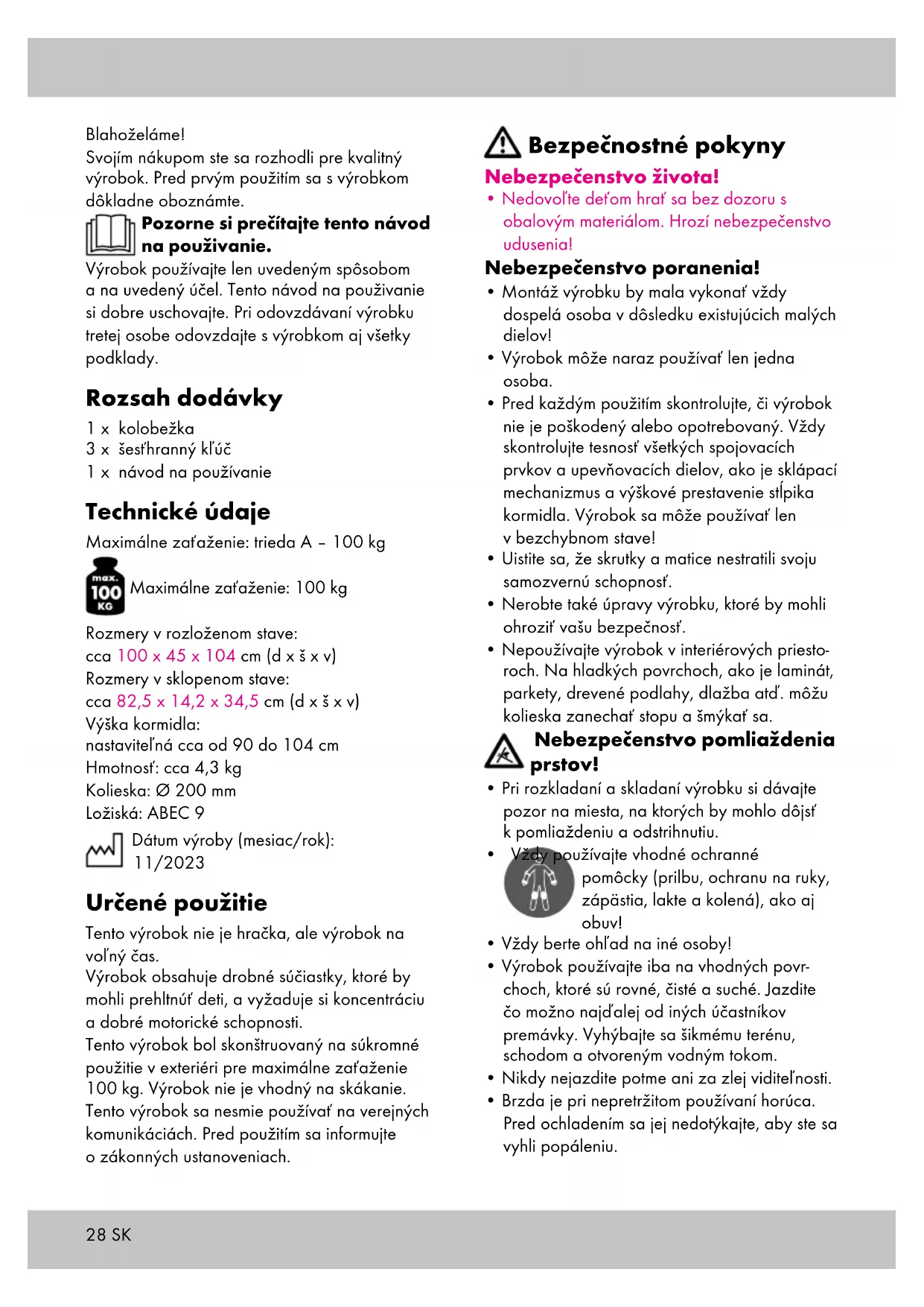 v odseku „Výmena koliesok“. Skladovanie, čistenie Po použití výrobku odporúčame dôkladné čistenie a sušenie. Odstráňte malé kamienky alebo iné predmety, ktoré sa za určitých okolností zachytili na kolies- kach. Mokré alebo vlhké guľkové ložiská osušte čistou handričkou. Ložiská zvonku namažte vhodným ložiskovým tukom, aby sa zabránilo tvorbe vonkajšej hrdze. Výrobok uschovajte vždy na suchom mieste. Pokyny k likvidácii Výrobok a obalový materiál zlikvidujte podľa aktuálnych miestnych predpisov. Obalový materiál (ako napr. fóliové vrecká) uschovajte mimo dosahu detí. Ďalšie informácie o možnostiach likvidácie zastaraného ýrobku dostanete na svojej obecnej alebo mestskej správe. Výrobok a obal zlikvidujte ekologicky. Recyklačný kód slúži na označenie rôznych materiálov za účelom vrátenia do kolobehu opätovného používania (recyklácia). Kód pozostáva z recyklačného symbolu pre zobrazenie kolobehu opätovného používania a čísla, ktoré označuje materiál. Pokyny k záruke a priebehu servisu Výrobok bol vyrobený veľmi starostlivo a pod stálou kontrolou. Na tento výrobok poskytuje DELTA-SPORT HANDELSKONTOR GmbH súk- romným koncovým užívateľom trojročnú záruku odo dňa kúpy (záručná lehota) po splnení nasle- dovných podmienok. Záruka platí len na chyby materiálu a spracovania. Záruka sa netýka dielov, ktoré podliehajú bežnému opotrebeniu a preto ich možno považovať za opotrebiteľné diely (napr. batérie), ako aj krehkých dielov, napr. vypínače, akumulátory alebo diely, ktoré sú vyrobené zo skla.31 Nároky z tejto záruky zanikajú, keď sa výrobok používal neodborne alebo nesprávne, mimo určenia na používanie alebo určeného rozsahu používania alebo neboli dodržané pokyny návodu na obsluhu, s výnimkou, že koncový uží- vateľ preukáže, že ide o chybu materiálu alebo spracovania, ktorá nebola spôsobená niektorou z hore uvedených okolností. Záruku je možné uplatniť len počas záručnej lehoty po predložení originálu pokladničného dokladu. Originál pokladničného dokladu preto prosím uschovajte. Záručná doba sa kvôli prípadným záručným opravám, zákonnej záruke alebo ako obchodné gesto nepredlžuje. Platí to aj pre vymenené a opravené diely. Pri reklamáciách sa prosím najskôr obráťte na dole uvedenú Service-Hotline alebo sa s nami spojte prostredníctvom e-mailu. Ak sa jedná o záručný prípad, výrobok – podľa našej voľby – bezplatne opravíme, vymeníme alebo vrátime kúpnu cenu. Ďalšie práva zo záruky nevyplý- vajú. Vaše zákonné práva, hlavne nároky na záručné plnenie voči príslušnému predajcovi, nie sú touto zárukou obmedzené. IAN: 437057_2304 Servis Slovensko Tel.: 0850 232001 E-Mail: deltasport@lidl.sk SK32 ES ¡Enhorabuena! Con su compra se ha decidido por un artículo de gran calidad. Familiarícese con el artículo antes de usarlo por primera vez. Para ello, lea detenidamente las siguientes instrucciones de uso. Use el artículo solo de la forma descrita y para los campos de aplicación indicados. Conserve estas instrucciones de uso a buen recaudo. Entregue todos los documentos en caso de traspasar el artículo a terceros. Alcance de suministro 1 patinete de ruedas grandes 3 llaves hexagonales 1 instrucciones de uso Datos técnicos Carga máxima: clase A – 100 kg Carga máxima: 100 kg Dimensiones desplegado: aprox. 100 x 45 x 104 cm (L x An x Al) Dimensiones plegado: aprox. 82,5 x 14,2 x 34,5 cm (L x An x Al) Altura del manillar: ajustable aprox. 90-104 cm Peso: aprox. 4,3 kg Ruedas: Ø 200 mm Rodamientos: ABEC 9 Fecha de fabricación (mes/año): 11/2023 Uso previsto El artículo no es un juguete, sino un artículo para el ocio. El artículo contiene piezas pequeñas que po- drían ser ingeridas por niños; además requiere concentración, así como buenas habilidades motoras. Este artículo se ha diseñado para uso privado en exteriores y una carga máxima de 100 kg. El artículo no es apto para realizar saltos. No se debe utilizar este artículo en la vía públi- ca. Antes de su utilización, infórmese sobre las disposiciones legales. Indicaciones de seguridad ¡Peligro de muerte!