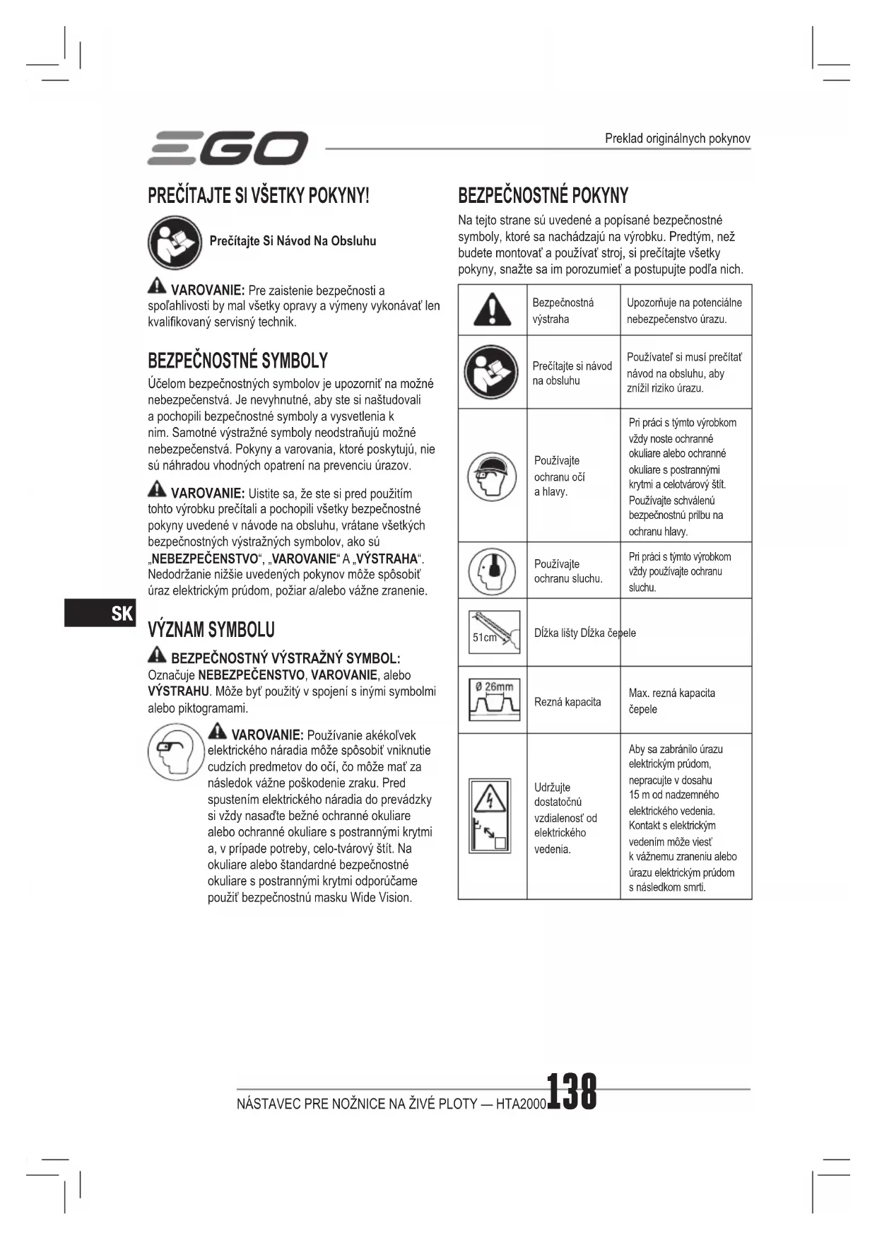 Na tejto strane sú uvedené a popísané bezpečnostné symboly, ktoré sa nachádzajú na výrobku. Predtým, než budete montovať a používať stroj, si prečítajte všetky pokyny, snažte sa im porozumieť a postupujte podľa nich. Bezpečnostná výstrahaUpozorňuje na potenciálne nebezpečenstvo úrazu.Prečítajte si návod na obsluhuPoužívateľ si musí prečítať návod na obsluhu, aby znížil riziko úrazu.Používajte ochranu očí a hlavy.Pri práci s týmto výrobkom vždy noste ochranné okuliare alebo ochranné okuliare s postrannými krytmi a celotvárový štít. Používajte schválenú bezpečnostnú prilbu na ochranu hlavy.Používajte ochranu sluchu.Pri práci s týmto výrobkom vždy používajte ochranu sluchu. 51cm Dĺžka lišty Dĺžka čepeleRezná kapacitaMax. rezná kapacita čepeleUdržujte dostatočnú vzdialenosť od elektrického vedenia.Aby sa zabránilo úrazu elektrickým prúdom, nepracujte v dosahu 15 m od nadzemného elektrického vedenia. Kontakt s elektrickým vedením môže viesť k vážnemu zraneniu alebo úrazu elektrickým prúdom s následkom smrti. Preklad originálnych pokynovNÁSTAVEC PRE NOŽNICE NA ŽIVÉ PLOTY — HTA2000 139