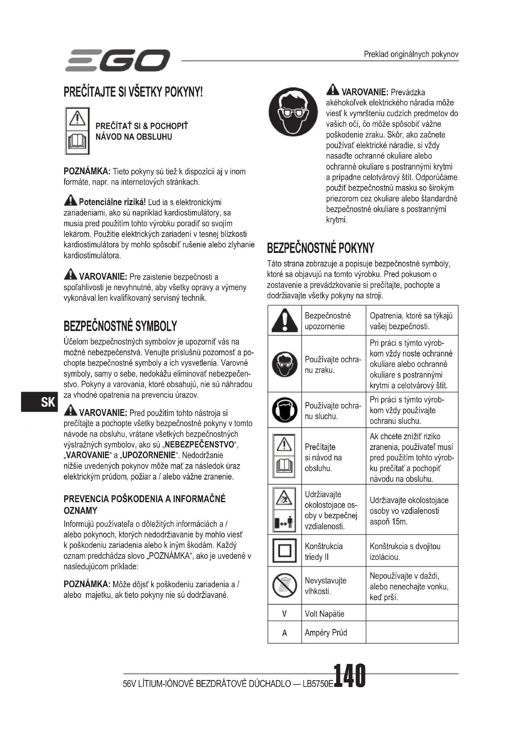 NÁRADIE ◾ Netlačte na elektrické náradie. Používajte správne náradie na vašu prácu. Správne elektrické náradie bude pracovať lepšie a bezpečnejšie pri rýchlosti, na ktorú bolo určené. ◾ Nepoužívajte elektrické náradie v prípade, že vypínač nie je možné zapnúť a vypnúť. Akékoľvek elektrické náradie, ktoré sa nedá ovládať vypínačom je nebezpečné a musí sa opraviť. ◾ Pred akýmkoľvek nastavovaním, výmenou príslušenstva alebo pred uložením elektrického náradia odpojte zástrčku od zdroja a/alebo akumulátora. Tieto preventívne bezpečnostné opatrenia znižujú riziko náhodného spustenia elektrického náradia. ◾ Uchovávajte nepoužívané elektronáradie mimo dosahu detí a nedovoľte, aby osoby neoboznámené s elektrickým náradím alebo s týmito pokynmi náradie používali. Elektrické náradie je nebezpečné v rukách neskúsených používateľov. ◾ Starajte sa o elektrické náradie. Skontrolujte nastavenie pohyblivých častí, poškodenie dielov a akékoľvek ďalšie okolnosti, ktoré môžu mať vplyv na funkciu elektrického náradia. Ak je elektrické náradie poškodené, nechajte ho pred použitím opraviť. Veľa úrazov je zapríčinených zle udržiavaným náradím. ◾ Rezacie nástroje udržiavajte ostré a čisté. Starostlivo ošetrované rezné nástroje s ostrými čepeľami menej pravdepodobne uviaznu a jednoduchšie sa ovládajú. ◾ Používajte elektrické náradie, príslušenstvo, násady a pod. Podľa týchto pokynov s prihliadnutím na pracovné podmienky a prácu, ktorá má byť vykonaná. Použitie elektrického náradia na iné ako určené účely môže viesť k nebezpečným situáciám. POUŽÍVANIE A STAROSTLIVOSŤ O NÁRADIE NA BATÉRIE ◾ Nabíjajte iba nabíjačkou určenou výrobcom. Nabíjačka vhodná pre jeden typ akumulátora môže spôsobiť riziko požiaru pri použití s iným akumulátorom. ◾ Používajte elektrické náradie iba s výslovne určenými akumulátormi. Použitie iných akumulátorov môže spôsobiť riziko úrazu a požiaru. ◾ Pokiaľ akumulátor nepoužívate, držte ho mimo dosahu kovových predmetov, ako sú kancelárske sponky na papier, mince, kľúče, klince, skrutky alebo ďalšie drobné kovové predmety, ktoré môžu spôsobiť vzájomné skratovanie vývodov. Skratovanie kontaktov akumulátora môže spôsobiť popáleniny alebo požiar. ◾ V nevhodných podmienkach môže kvapalina unikať z batérie. Zabráňte kontaktu. Pri náhodnom kontakte opláchnite vodou. Pri zasiahnutí očí vyhľadajte lekársku pomoc. Unikajúca kvapalina z akumulátora môže spôsobiť podráždenie pokožky alebo popáleniny. OPRAVA ◾ Nechajte vaše elektrické náradie opraviť kvalikovanou osobou s použitím iba identických náhradných dielov. Tým sa zabezpečí, že bezpečnosť stroja zostane zachovaná. PRED POUŽITÍM TOHTO VÝROBKU SI PREČÍTAJTE VŠETKY POKYNY! ŠKOLENIE ◾ Prečítajte si pozorne tieto pokyny. Zoznámte sa s ovládacími prvkami a správnym používaním spotrebiča. ◾ Nikdy nedovoľte používať stroj deťom, osobám so zníženými fyzickými, zmyslovými alebo duševnými schopnosťami, alebo nedostatkom skúseností a znalostí alebo ľuďom, ktorí nie sú oboznámení s týmito pokynmi. ◾ Nikdy nedovoľte používať stroj ľuďom, ktorí nie sú oboznámení s týmito pokynmi. Miestne predpisy môžu obmedzovať vek obsluhy. ◾ Nikdy nepoužívajte zariadenie, ak sú v blízkosti ľudia, najmä deti, alebo domáce zvieratá. ◾ Obsluha alebo používateľ je zodpovedný za nehody a nepredvídané udalosti voči iným osobám a ich majetku. PRÍPRAVA ◾ Pri práci so zariadením vždy noste pevnú obuv a dlhé nohavice.56V LÍTIUM-IÓNOVÉ BEZDRÁTOVÉ DÚCHADLO — LB5750E