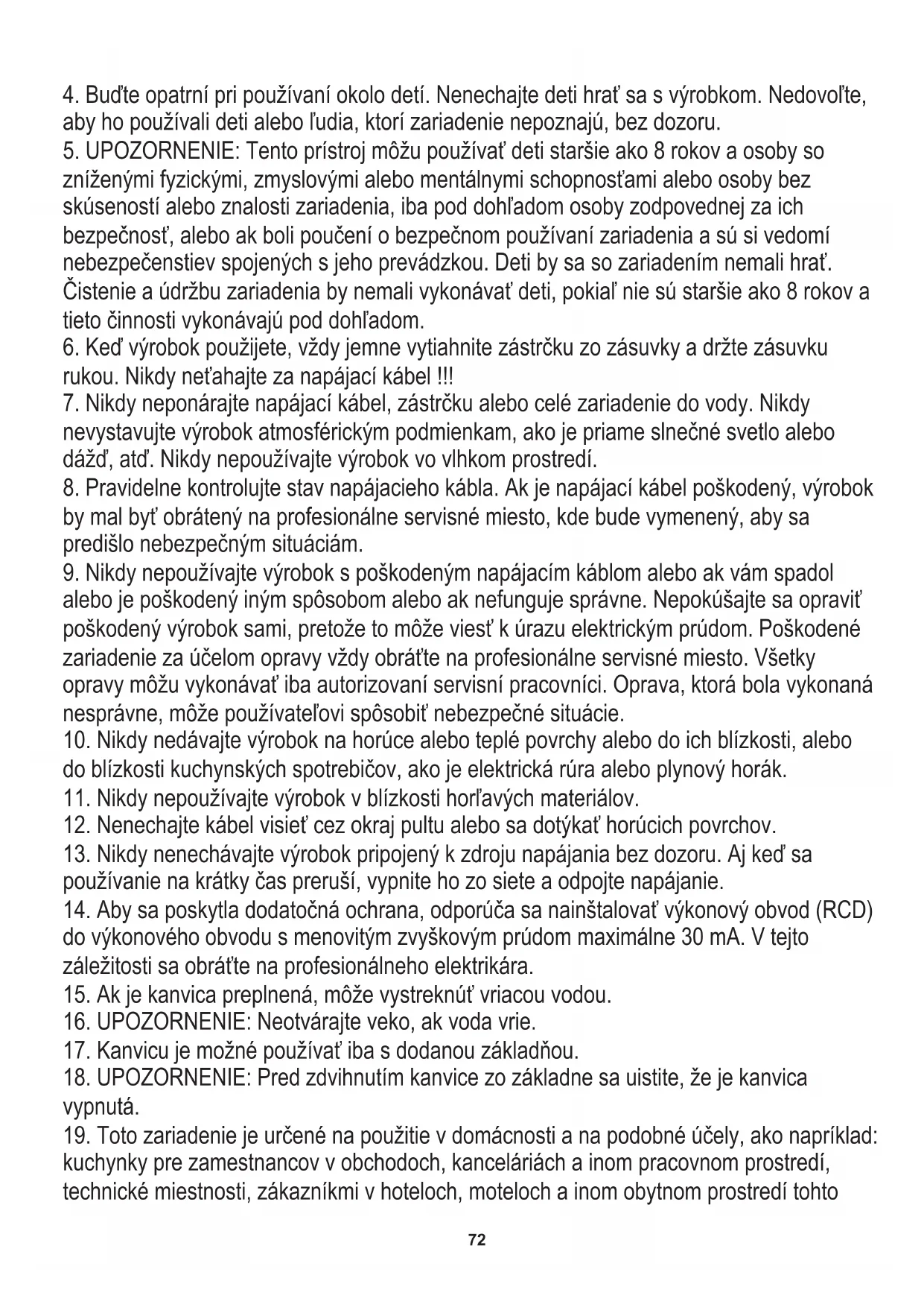 zníženými fyzickými, zmyslovými alebo mentálnymi schopnosťami alebo osoby bez skúseností alebo znalosti zariadenia, iba pod dohľadom osoby zodpovednej za ich bezpečnosť, alebo ak boli poučení o bezpečnom používaní zariadenia a sú si vedomí nebezpečenstiev spojených s jeho prevádzkou. Deti by sa so zariadením nemali hrať. Čistenie a údržbu zariadenia by nemali vykonávať deti, pokiaľ nie sú staršie ako 8 rokov a tieto činnosti vykonávajú pod dohľadom.