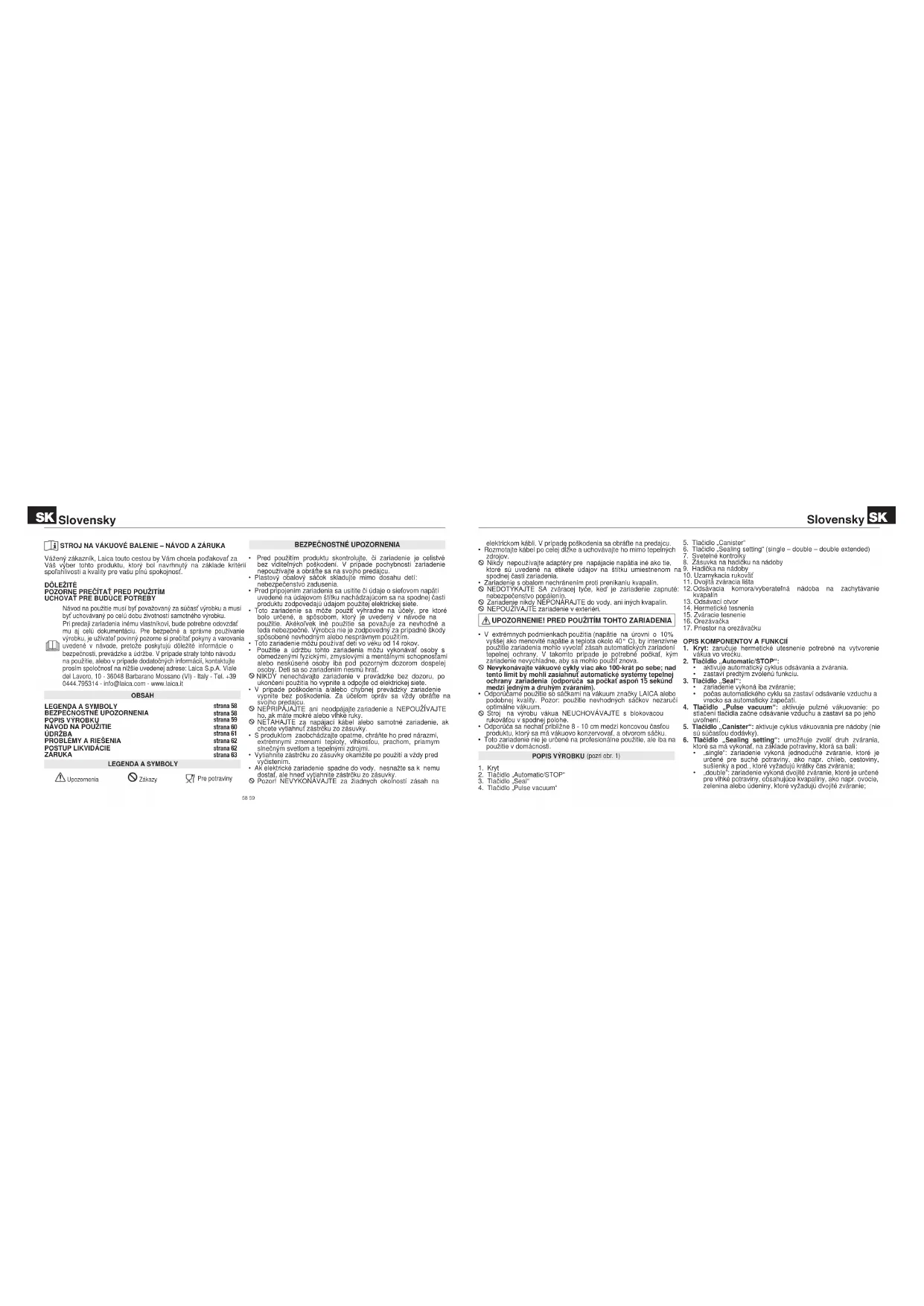 Czech58 59 STROJ NA VÁKUOVÉ BALENIE – NÁVOD A ZÁRUKA Vážený zákazník, Laica touto cestou by Vám chcela poďakovať za Váš výber tohto produktu, ktorý bol navrhnutý na základe kritérií spoľahlivosti a kvality pre vašu plnú spokojnosť.