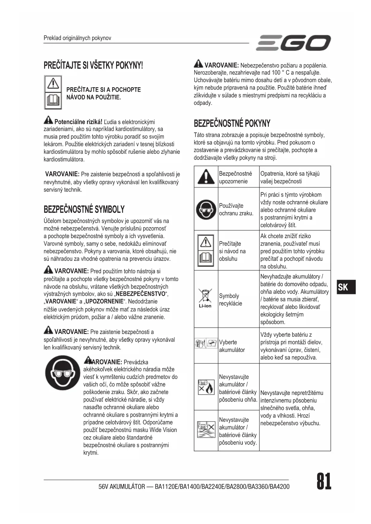 Nevystavujte akumulátor / batériové články pôsobeniu vody. Preklad originálnych pokynov56V AKUMULÁTOR — BA1120E/BA1400/BA2240E/BA2800/BA3360/BA420082