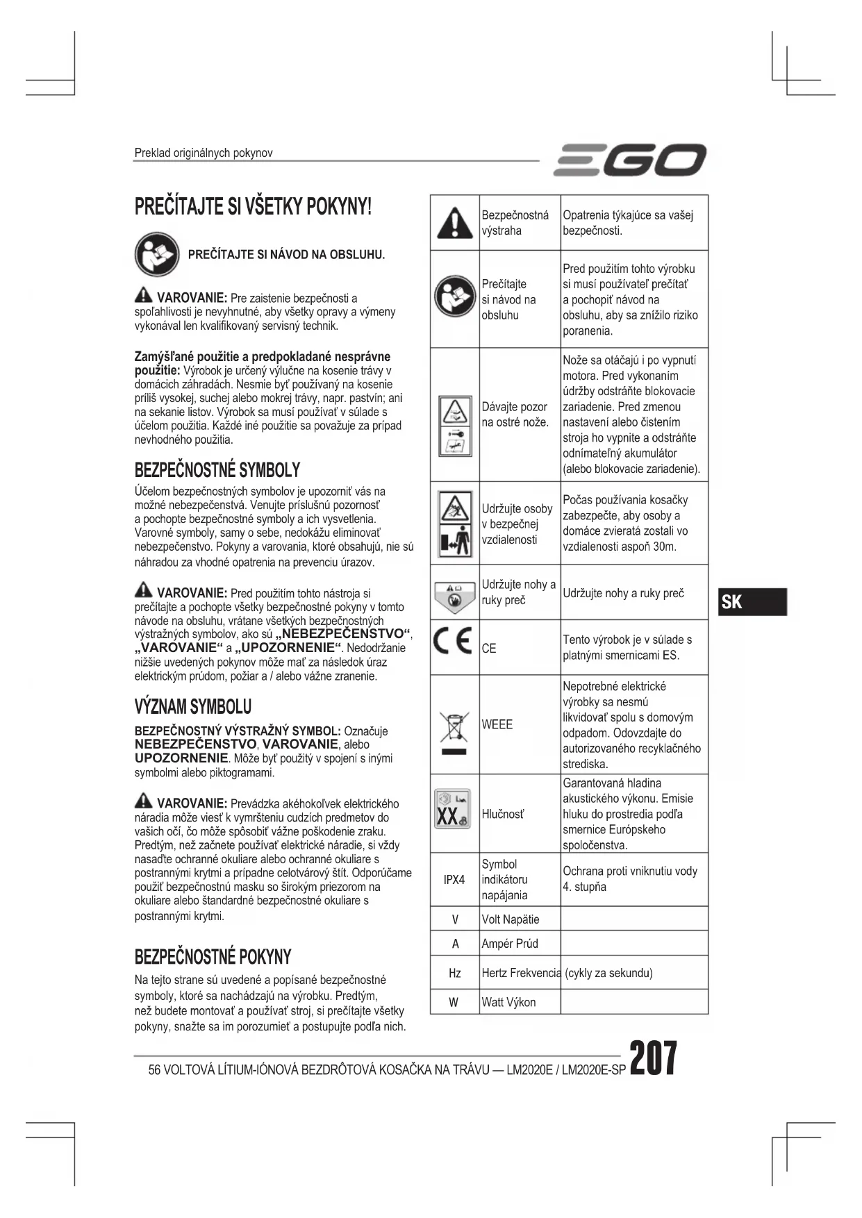 Na tejto strane sú uvedené a popísané bezpečnostné symboly, ktoré sa nachádzajú na výrobku. Predtým, než budete montovať a používať stroj, si prečítajte všetky pokyny, snažte sa im porozumieť a postupujte podľa nich.Bezpečnostná výstrahaOpatrenia týkajúce sa vašej bezpečnosti.Prečítajte si návod na obsluhuPred použitím tohto výrobku si musí používateľ prečítať a pochopiť návod na obsluhu, aby sa znížilo riziko poranenia.Dávajte pozor na ostré nože.Nože sa otáčajú i po vypnutí motora. Pred vykonaním údržby odstráňte blokovacie zariadenie. Pred zmenou nastavení alebo čistením stroja ho vypnite a odstráňte odnímateľný akumulátor (alebo blokovacie zariadenie).Udržujte osoby v bezpečnej vzdialenostiPočas používania kosačky zabezpečte, aby osoby a domáce zvieratá zostali vo vzdialenosti aspoň 30m.Udržujte nohy a ruky prečUdržujte nohy a ruky preč Tento výrobok je v súlade s platnými smernicami ES. WEEE Nepotrebné elektrické výrobky sa nesmú likvidovať spolu s domovým odpadom. Odovzdajte do autorizovaného recyklačného strediska. HlučnosťGarantovaná hladina akustického výkonu. Emisie hluku do prostredia podľa smernice Európskeho spoločenstva. IPX4 Symbol indikátoru napájaniaOchrana proti vniknutiu vody 4. stupňa Volt Napätie Ampér Prúd Hertz Frekvencia (cykly za sekundu) Watt VýkonPreklad originálnych pokynov56 VOLTOVÁ LÍTIUM-IÓNOVÁ BEZDRÔTOVÁ KOSAČKA NA TRÁVU — LM2020E / LM2020E-SP208