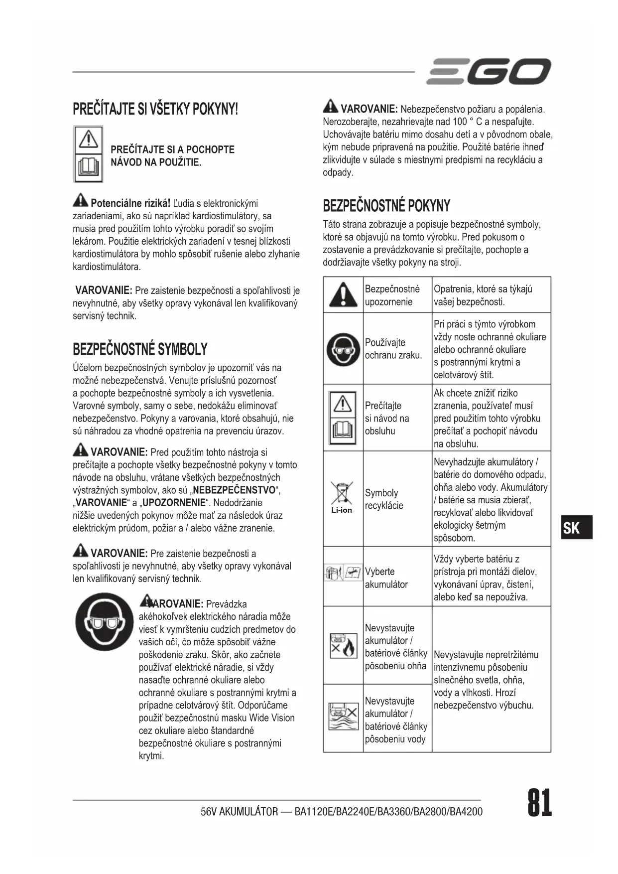 Táto strana zobrazuje a popisuje bezpečnostné symboly, ktoré sa objavujú na tomto výrobku. Pred pokusom o zostavenie a prevádzkovanie si prečítajte, pochopte a dodržiavajte všetky pokyny na stroji. Bezpečnostné upozornenie Opatrenia, ktoré sa týkajú vašej bezpečnosti. Používajte ochranu zraku. Pri práci s týmto výrobkom vždy noste ochranné okuliare alebo ochranné okuliare s postrannými krytmi a celotvárový štít. Prečítajte si návod na obsluhu Ak chcete znížiť riziko zranenia, používateľ musí pred použitím tohto výrobku prečítať a pochopiť návodu na obsluhu. Li-ion Symboly recyklácie Nevyhadzujte akumulátory / batérie do domového odpadu, ohňa alebo vody. Akumulátory / batérie sa musia zbierať, recyklovať alebo likvidovať ekologicky šetrným spôsobom. Vyberte akumulátor Vždy vyberte batériu z prístroja pri montáži dielov, vykonávaní úprav, čistení, alebo keď sa nepoužíva. Nevystavujte akumulátor / batériové články pôsobeniu ohňa Nevystavujte nepretržitému intenzívnemu pôsobeniu slnečného svetla, ohňa, vody a vlhkosti. Hrozí nebezpečenstvo výbuchu. Nevystavujte akumulátor / batériové články pôsobeniu vody56V AKUMULÁTOR — BA1120E/BA2240E/BA3360/BA2800/BA420082