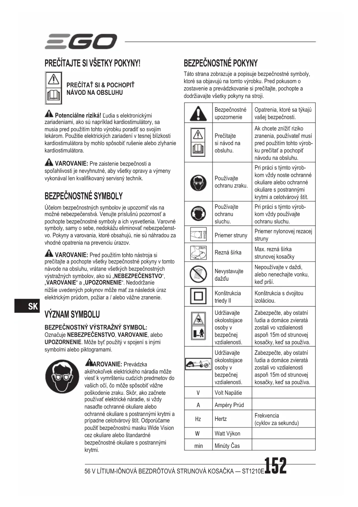 BA1120E, BA2240E, BA2800, BA3360, BA4200 CH5500E, CH2100E ◾ Pred likvidáciou musí byť akumulátor odstránený zo spotrebiča. ◾ Batérie likvidujte bezpečným spôsobom. ◾ Batérie nevyhadzujte do ohňa. Články môžu explodovať. Pozrite si miestne vyhlášky so špeciálnymi pokynmi na likvidáciu. ◾ Neotvárajte alebo nepoškodzujte batérie. Uvoľnený elektrolyt je žieravina a môže spôsobiť poškodenie očí alebo kože. Môže byť toxická pri požití. ◾ Pri manipulácii s batériami buďte opatrní, aby nedošlo ku skratovaniu batérie vodivými materiálmi, ako sú prstene, náramky a kľúče. Batérie alebo vodiče sa môžu prehriať a spôsobiť popáleniny.56 V LÍTIUM-IÔNOVÁ BEZDRÔTOVÁ STRUNOVÁ KOSAČKA — ST1210E