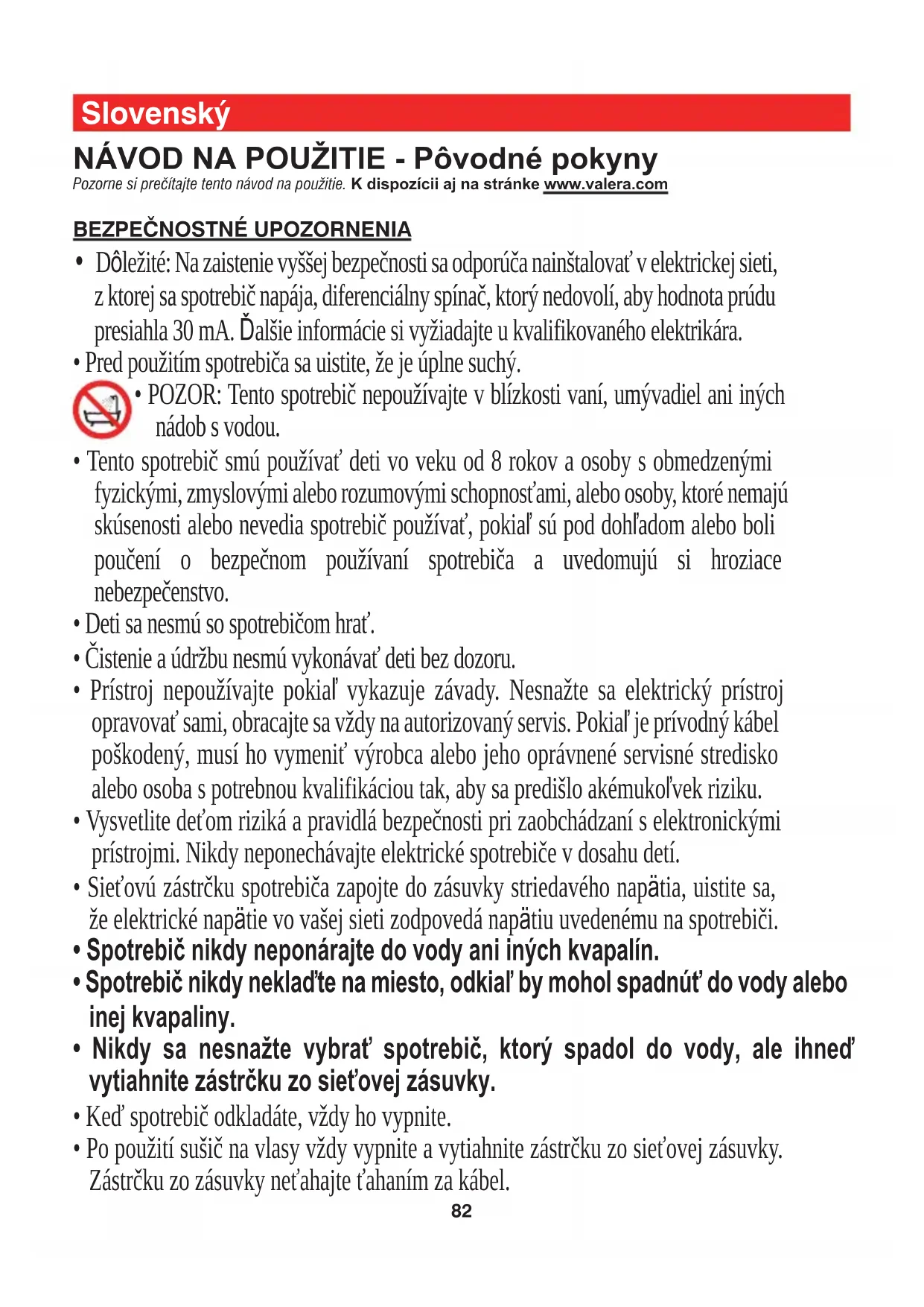 - POZOR: Tento spotrebič nepoužívajte v blízkosti vaní, umývadiel ani iných nádob s vodou.
