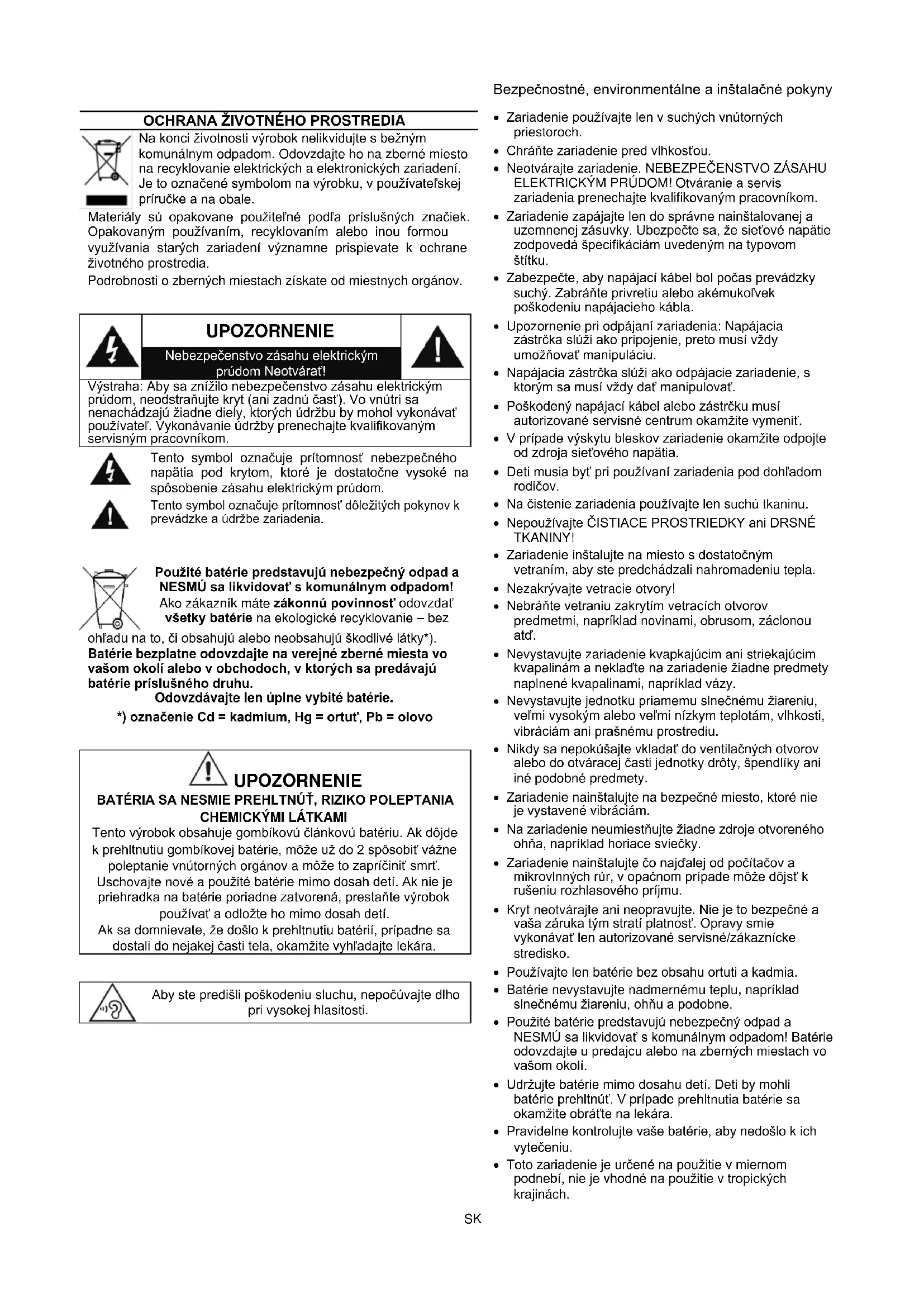 ohľadu na to, či obsahujú alebo neobsahujú škodlivé látky*). Batérie bezplatne odovzdajte na verejné zberné miesta vo vašom okolí alebo v obchodoch, v ktorých sa predávajú batérie príslušného druhu. Odovzdávajte len úplne vybité batérie. *) označenie Cd = kadmium, Hg = ortuť, Pb = olovo