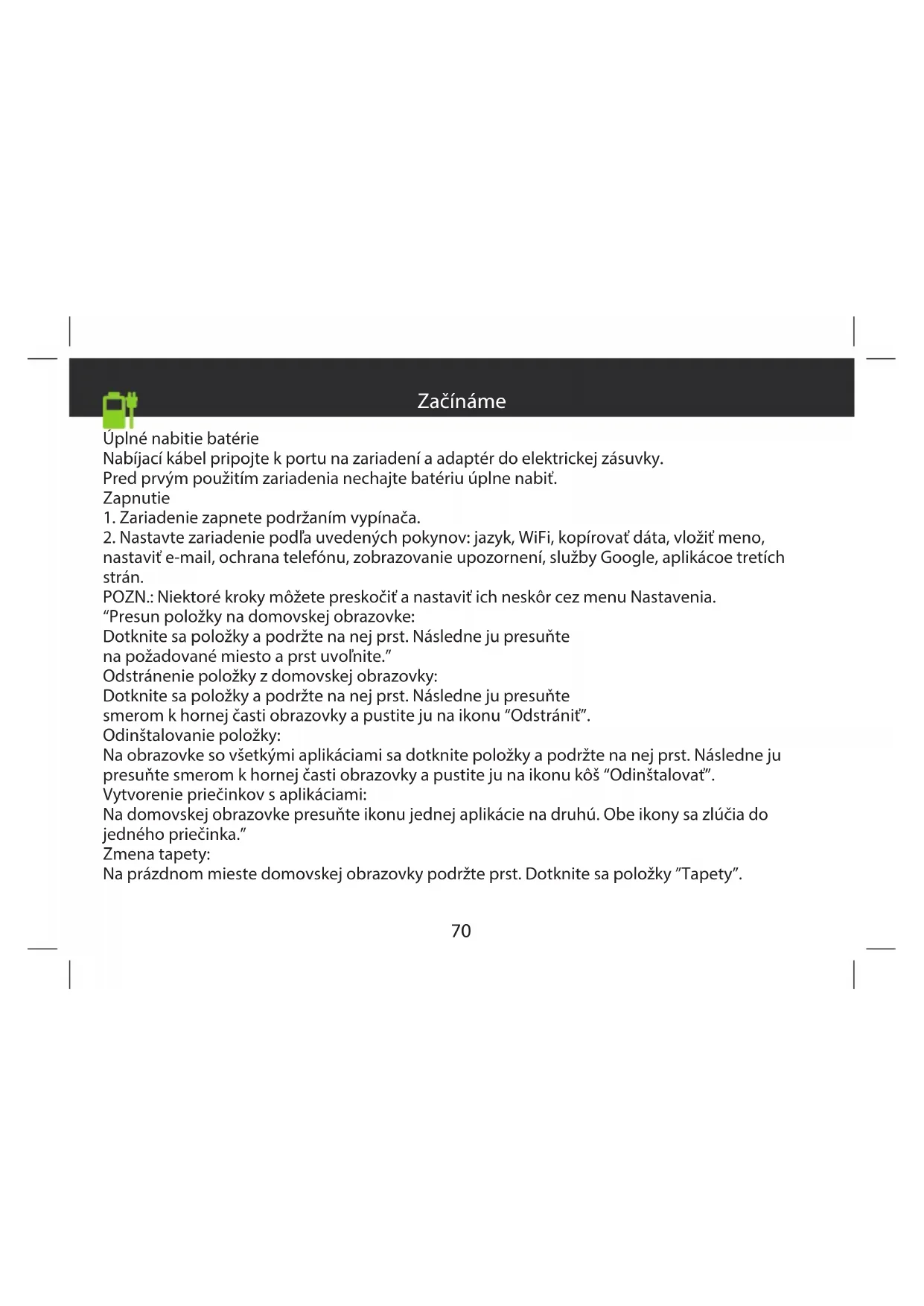 Popis zariadenia zadná kamera resetovať vypínač konektor pre slúchadlá konektor microUSB volume +/- predný fotoaparát rečník mikrofón rečník Kryt pre slot karty7070 Začínáme Úplné nabitie batérie Nabíjací kábel pripojte k portu na zariadení a adaptér do elektrickej zásuvky. Pred prvým použitím zariadenia nechajte batériu úplne nabiť. Zapnutie