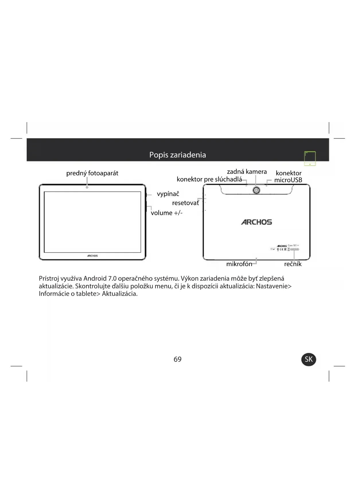 Popis zariadenia zadná kamera resetovať vypínač konektor pre slúchadlá konektor microUSB volume +/- predný fotoaparát Prístroj využíva Android 7.0 operačného systému. Výkon zariadenia môže byť zlepšená aktualizácie. Skontrolujte ďalšiu položku menu, či je k dispozícii aktualizácia: Nastavenie> Informácie o tablete> Aktualizácia. rečník mikrofón7070 Začínáme Úplné nabitie batérie Nabíjací kábel pripojte k portu na zariadení a adaptér do elektrickej zásuvky. Pred prvým použitím zariadenia nechajte batériu úplne nabiť. Zapnutie