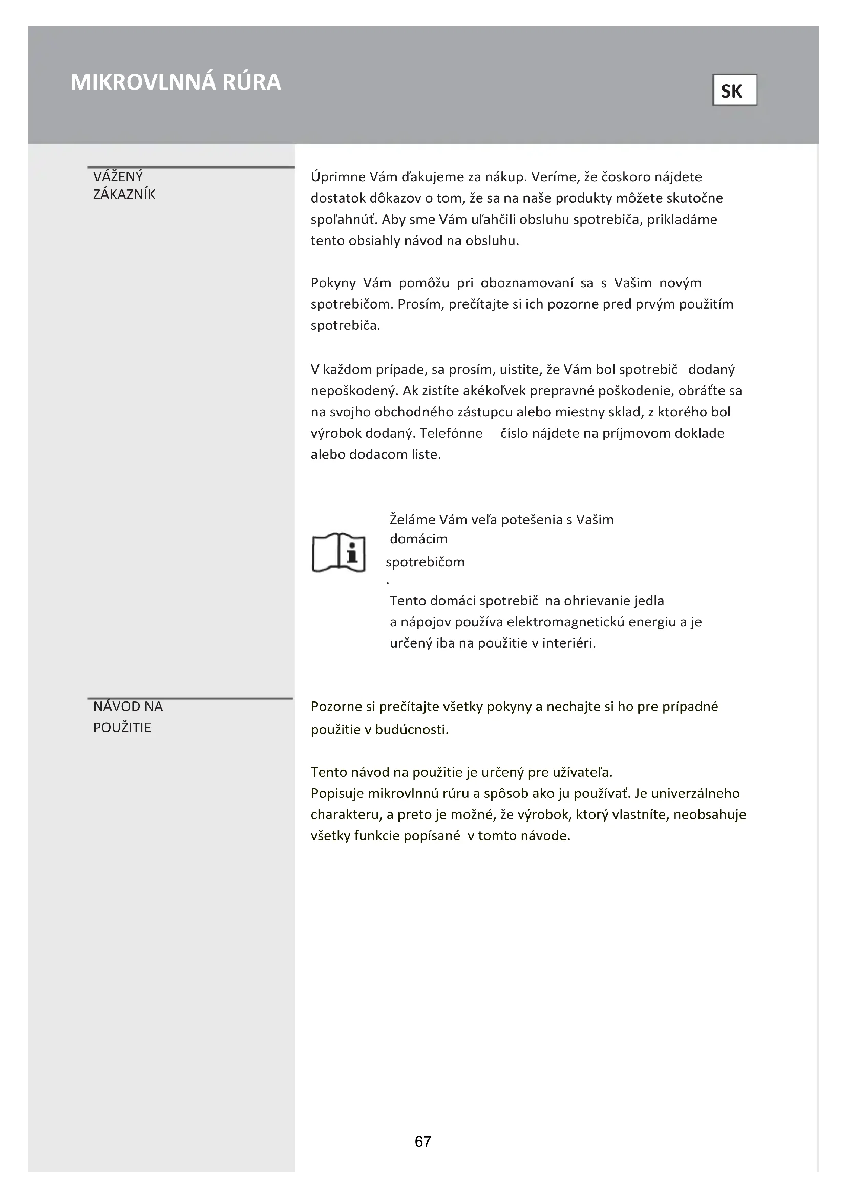 POUŽITIE Pozorne si prečítajte všetky pokyny a nechajte si ho pre prípadné použitie v budúcnosti. Tento návod na použitie je určený pre užívateľa. Popisuje mikrovlnnú rúru a spôsob ako ju používať. Je univerzálneho charakteru, a preto je možné, že výrobok, ktorý vlastníte, neobsahuje všetky funkcie popísané v tomto návode.