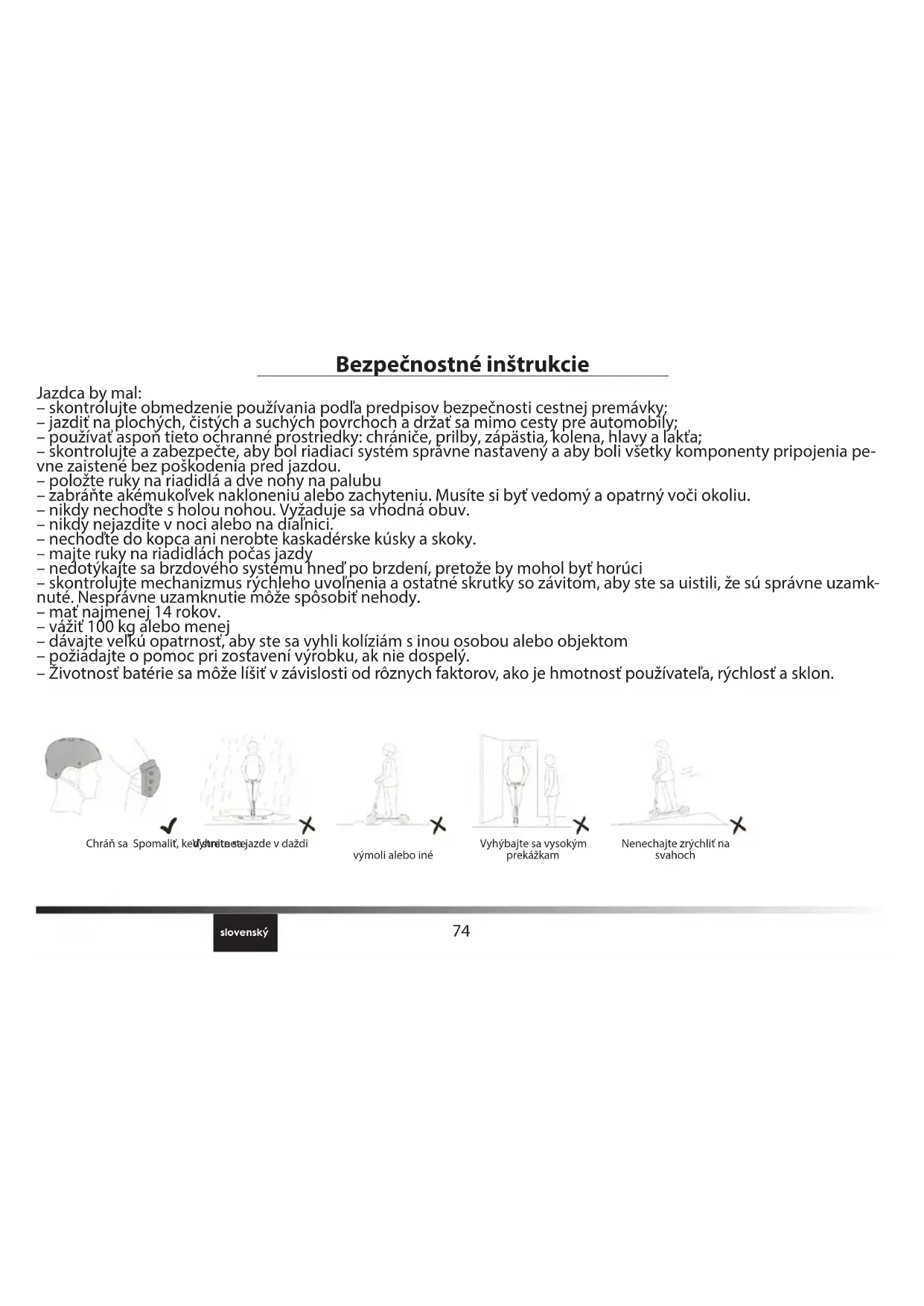 Prevznem in izdajanje naprav Ponedeljek/ Sreda/Petek: 12:30 - 16h Torekk/Četrtek: 12:30 - 17h73 slovenski Pridruži se nam Čestitam za nakup vaše naprave Archos! Za več informacij obiščite nas na: twitter.com/archos www.facebook.com/archos Blog https://blog.archos.com/ http://faq.archos.com/ Podpora: www. archos.com, kliknite Podpora> Podpora After- sales Izjava o skladnosti: www.archos.com, kliknite Podpora> Preno- si> Izjava o skladnosti Ta različica prihaja iz francoskega prevoda.74 slovenský Bezpečnostné inštrukcie Jazdca by mal: – skontrolujte obmedzenie používania podľa predpisov bezpečnosti cestnej premávky; – jazdiť na plochých, čistých a suchých povrchoch a držať sa mimo cesty pre automobily; – používať aspoň tieto ochranné prostriedky: chrániče, prilby, zápästia, kolena, hlavy a lakťa; – skontrolujte a zabezpečte, aby bol riadiaci systém správne nastavený a aby boli všetky komponenty pripojenia pe- vne zaistené bez poškodenia pred jazdou. – položte ruky na riadidlá a dve nohy na palubu – zabráňte akémukoľvek nakloneniu alebo zachyteniu. Musíte si byť vedomý a opatrný voči okoliu. – nikdy nechoďte s holou nohou. Vyžaduje sa vhodná obuv. – nikdy nejazdite v noci alebo na diaľnici. – nechoďte do kopca ani nerobte kaskadérske kúsky a skoky. – majte ruky na riadidlách počas jazdy – nedotýkajte sa brzdového systému hneď po brzdení, pretože by mohol byť horúci – skontrolujte mechanizmus rýchleho uvoľnenia a ostatné skrutky so závitom, aby ste sa uistili, že sú správne uzamk- nuté. Nesprávne uzamknutie môže spôsobiť nehody. – mať najmenej 14 rokov. – vážiť 100 kg alebo menej – dávajte veľkú opatrnosť, aby ste sa vyhli kolíziám s inou osobou alebo objektom – požiadajte o pomoc pri zostavení výrobku, ak nie dospelý. – Životnosť batérie sa môže líšiť v závislosti od rôznych faktorov, ako je hmotnosť používateľa, rýchlosť a sklon. Vyhýbajte sa vysokým prekážkam Nenechajte zrýchliť na svahoch Chráň sa Spomaliť, keď stretnete výmoli alebo iné Vyhnite sa jazde v daždi75