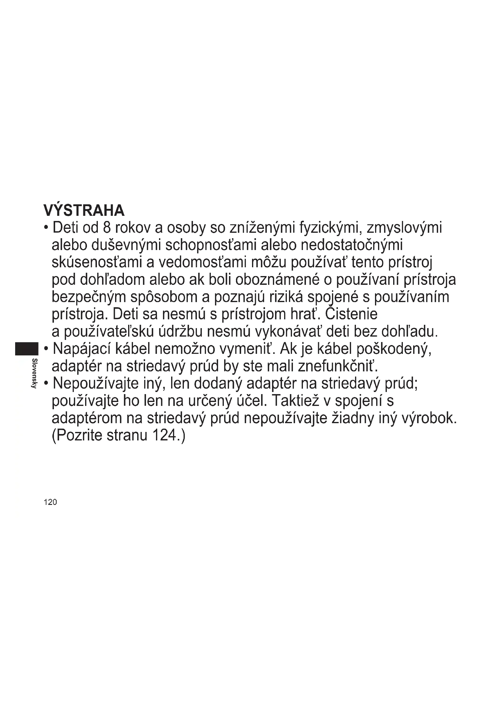 - Nepoužívajte iný, len dodaný adaptér na striedavý prúd; používajte ho len na určený účel. Taktiež v spojení s adaptérom na striedavý prúd nepoužívajte žiadny iný výrobok. (Pozrite stranu 124.)121 Slovensky