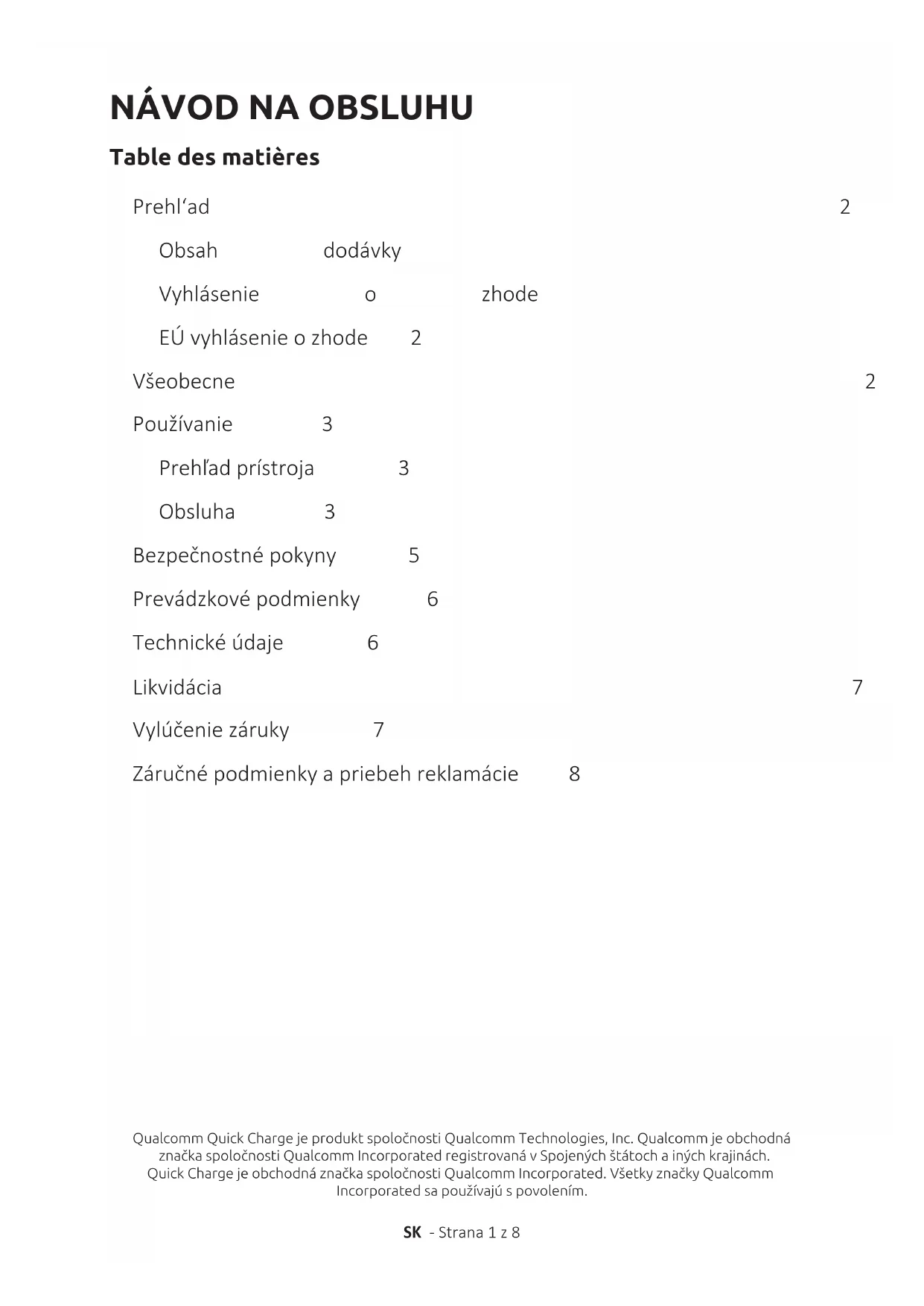 INTENSO INTERNATIONAL GMBH I Service Center (Państwa nr RMA) Kopernikusstraße 12-14 I D-49377 VechtaNÁVOD NA OBSLUHU SK - Strana 1 z 8 Table des matières Prehl‘ad 2 Obsah dodávky 2 Vyhlásenie o zhode 2 EÚ vyhlásenie o zhode 2 Všeobecne 2 Používanie 3 Prehľadprístroja 3 Obsluha 3 Bezpečnostnépokyny 5 Prevádzkovépodmienky 6 Technickéúdaje 6 Likvidácia 7 Vylúčeniezáruky 7 Záručnépodmienkyapriebehreklamácie 8 Qualcomm Quick Charge je produkt spoločnosti Qualcomm Technologies, Inc. Qualcomm je obchodná značka spoločnosti Qualcomm Incorporated registrovaná v Spojených štátoch a iných krajinách. Quick Charge je obchodná značka spoločnosti Qualcomm Incorporated. Všetky značky Qualcomm Incorporated sa používajú s povolením.SK - Strana 2 z 8