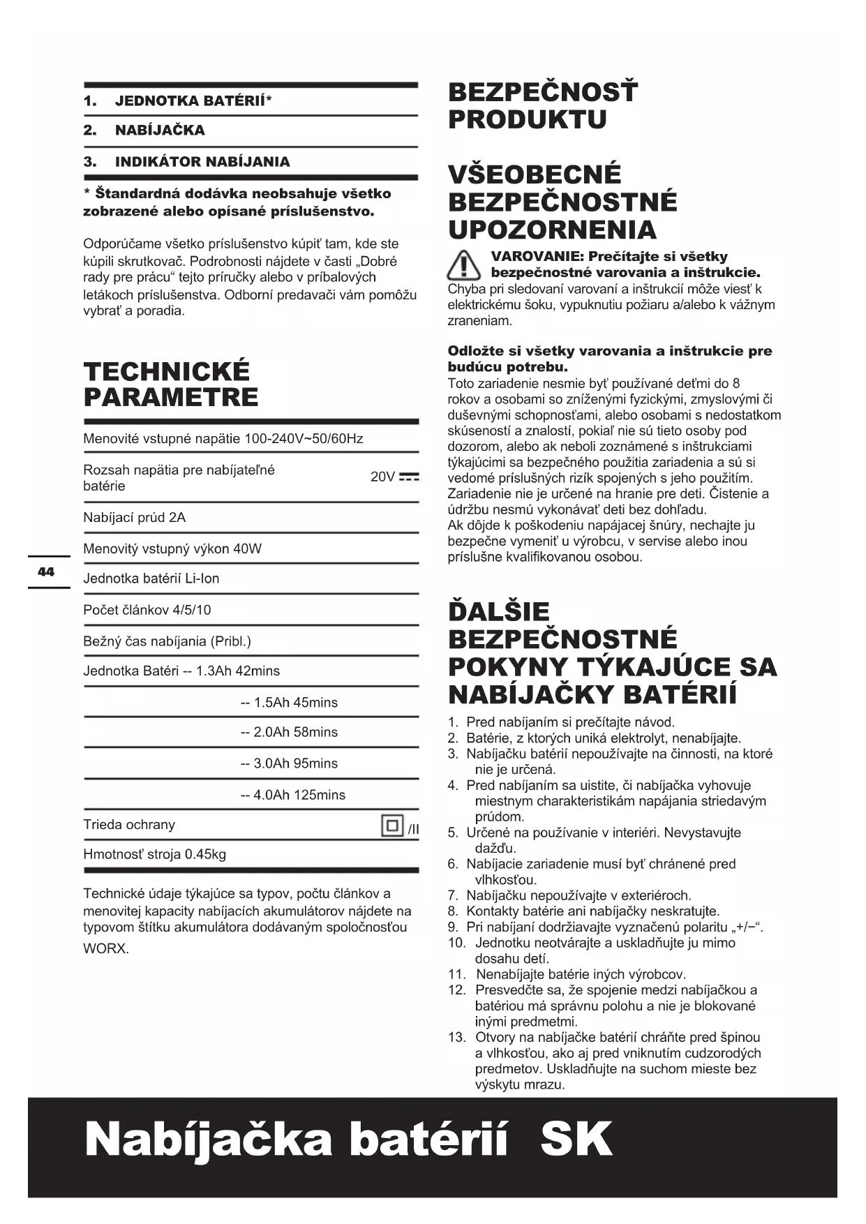 *Štandardnádodávkaneobsahujevšetko zobrazenéaleboopísanépríslušenstvo. Odporúčame všetko príslušenstvo kúpiť tam, kde ste kúpili skrutkovač. Podrobnosti nájdete v časti „Dobré rady pre prácu“ tejto príručky alebo v príbalových letákoch príslušenstva. Odborní predavači vám pomôžu vybrať a poradia. TECHNICKÉ PARAMETRE Menovité vstupné napätie 100-240V~50/60Hz Rozsah napätia pre nabíjateľné batérie 20V Nabíjací prúd 2A Menovitý vstupný výkon 40W Jednotka batérií Li-Ion Počet článkov 4/5/10 Bežný čas nabíjania (Pribl.) Jednotka Batéri -- 1.3Ah 42mins -- 1.5Ah 45mins -- 2.0Ah 58mins -- 3.0Ah 95mins -- 4.0Ah 125mins Trieda ochrany /II Hmotnosť stroja 0.45kg Technické údaje týkajúce sa typov, počtu článkov a menovitej kapacity nabíjacích akumulátorov nájdete na typovom štítku akumulátora dodávaným spoločnosťou WORX. BEZPEČNOSŤ PRODUKTU VŠEOBECNÉ BEZPEČNOSTNÉ UPOZORNENIA VAROVANIE:Prečítajtesivšetky bezpečnostnévarovaniaainštrukcie. Chyba pri sledovaní varovaní a inštrukcií môže viesť k elektrickému šoku, vypuknutiu požiaru a/alebo k vážnym zraneniam. Odložtesivšetkyvarovaniaainštrukciepre budúcupotrebu. Toto zariadenie nesmie byť používané deťmi do 8 rokov a osobami so zníženými fyzickými, zmyslovými či duševnými schopnosťami, alebo osobami s nedostatkom skúseností a znalostí, pokiaľ nie sú tieto osoby pod dozorom, alebo ak neboli zoznámené s inštrukciami týkajúcimi sa bezpečného použitia zariadenia a sú si vedomé príslušných rizík spojených s jeho použitím. Zariadenie nie je určené na hranie pre deti. Čistenie a údržbu nesmú vykonávať deti bez dohľadu. Ak dôjde k poškodeniu napájacej šnúry, nechajte ju bezpečne vymeniť u výrobcu, v servise alebo inou príslušne kvalikovanou osobou. ĎALŠIE BEZPEČNOSTNÉ