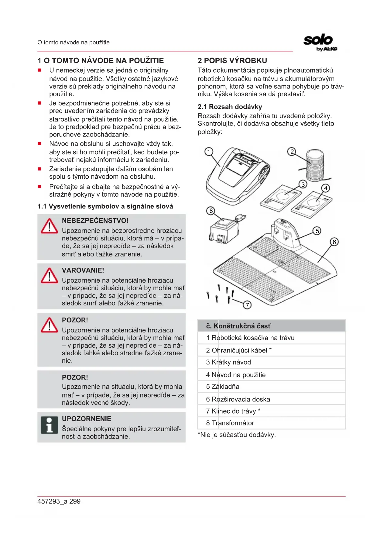 č. Konštrukčná časť 1 Robotická kosačka na trávu 2 Ohraničujúci kábel * 3 Krátky návod 4 Návod na použitie 5 Základňa 6 Rozširovacia doska 7 Klinec do trávy * 8 Transformátor *Nie je súčasťou dodávky.SK 300 Robolinho 3100 Popis výrobku